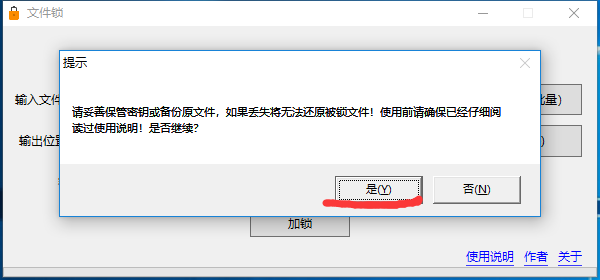 5.点击【加锁】,再次提示必须要牢记,请妥善保存。忘记或者丢失后将无法解锁文件确定你已经记住密钥/密码,点击【是】。