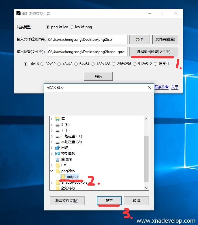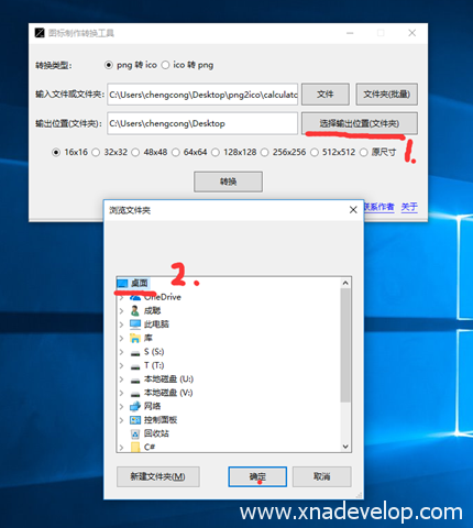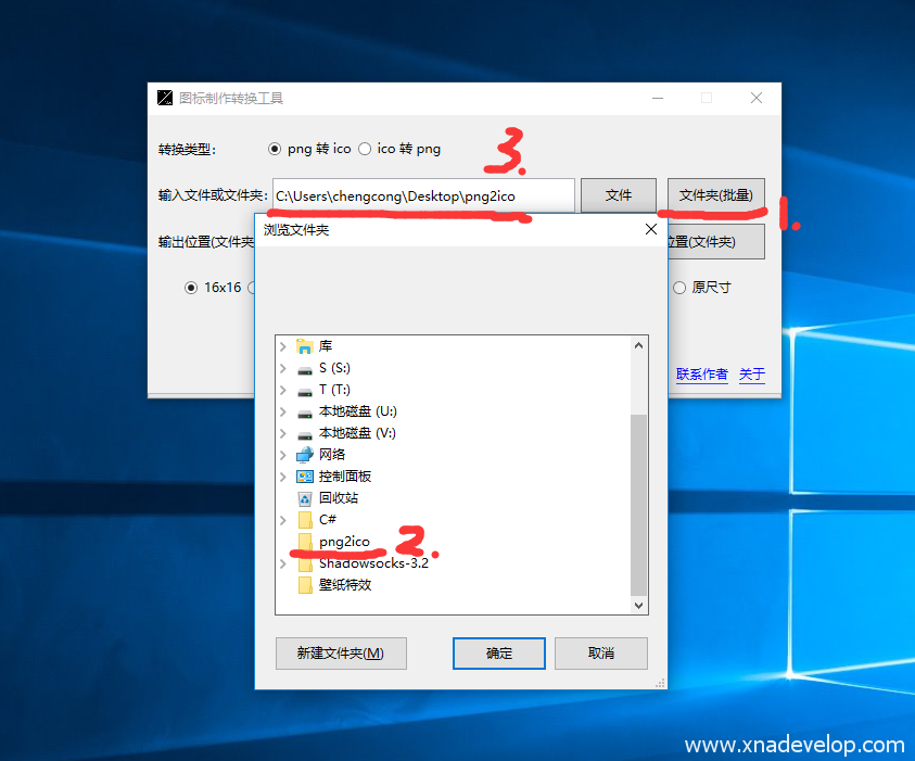 2.先选择需要【png转ico】还是【ico转png】,点击【文件夹(批量)】,选中png2ico文件夹,点击【确定】