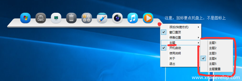 鼠标移动到托盘上,点击右键,选择主题,既可以切换