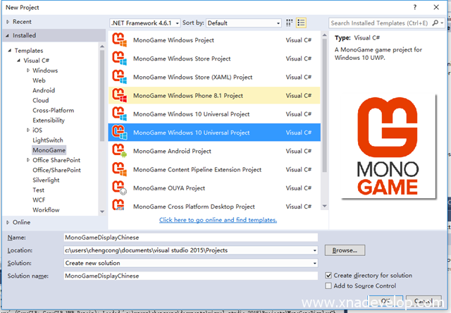6.新建MonoGame游戏项目,命名为:MonoGameDisplayChinese,以UWP项目为例