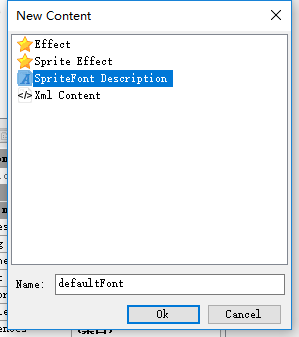 7.找到项目Content目录的Content.mgcb,双击打开它,选中Content右键【Add】【New Item】【SpriteFont Description】命名为defaultFont,在Content目录可以就找到defaultFont.spritefont文件。