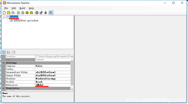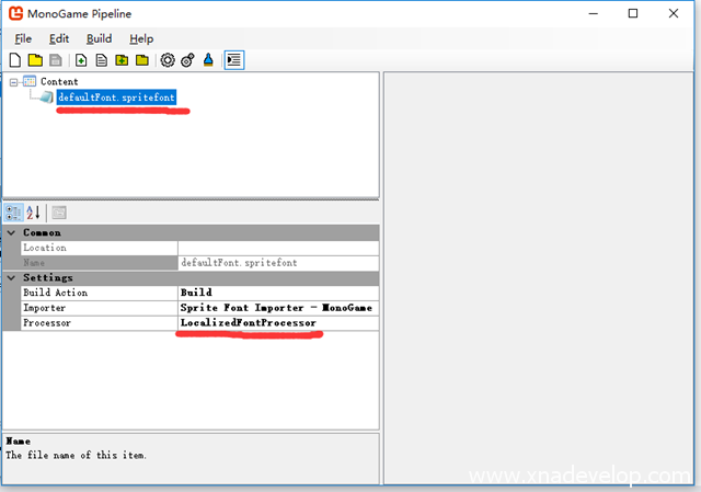 11.再次打开Content.mgcb,选中defaultFont.spritefont会发现Processor已经改变了。(GUI模式是没法改这个值的)