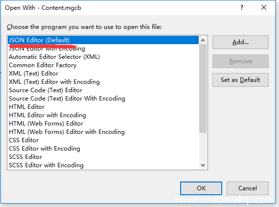 10.回到MonoGameDisplayChinese项目,选中Content.mgcb,右键Open With,选择JSON Editor打开,任何文本编辑器都可以打开!