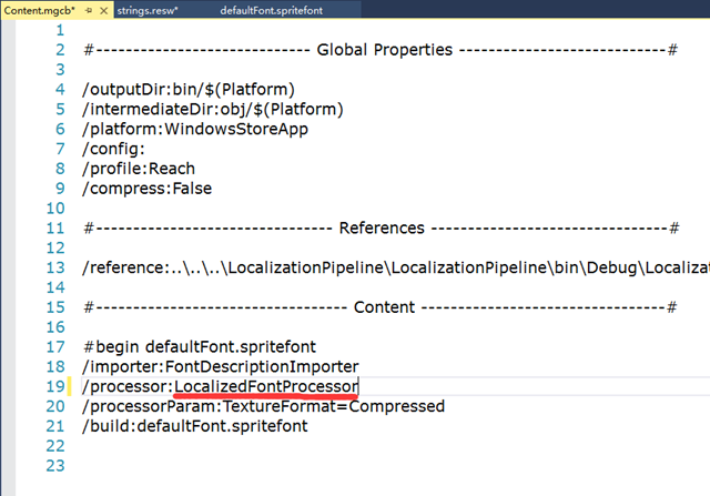 8.使用Visual Studio打开defaultFont.spritefont,修改XnaContent标签中的Asset的Type值为LocalizationPipeline.LocalizedFontDescription,