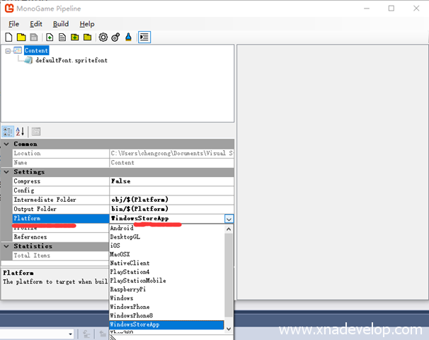 12.选中Content,找到Platform,修改成对应的平台如果是UWP就选择WindowsStoreApp