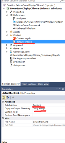 14.复制生成的defaultFont.xnb文件到MonoGameDisplayChinese项目的Content目录,修改Build Action类型为Content,输出目录设置为总是即Copy always