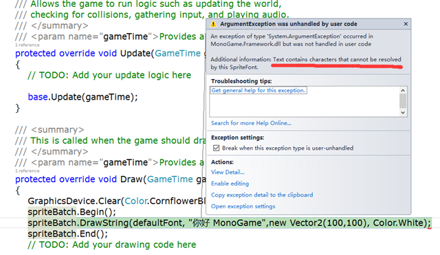 MonoGame和XNA一样显示中文会报错,如图,所以需要对英文以外的其他字符做特殊处理。