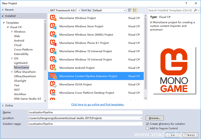 1.新建【MonoGame Cotent Pipeline Extension Project】命名为:LocalizationPipeline,删除ContentImporter1.cs,ContentProcessor1.cs