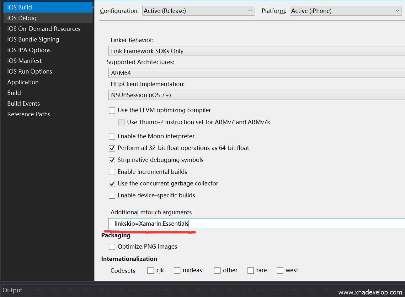 选中iOS项目右键【属性】【iOS生成】在添加mtouch参数中加入【–linkskip=Xamarin.Essentials】,然后重新打包ipa,提交!