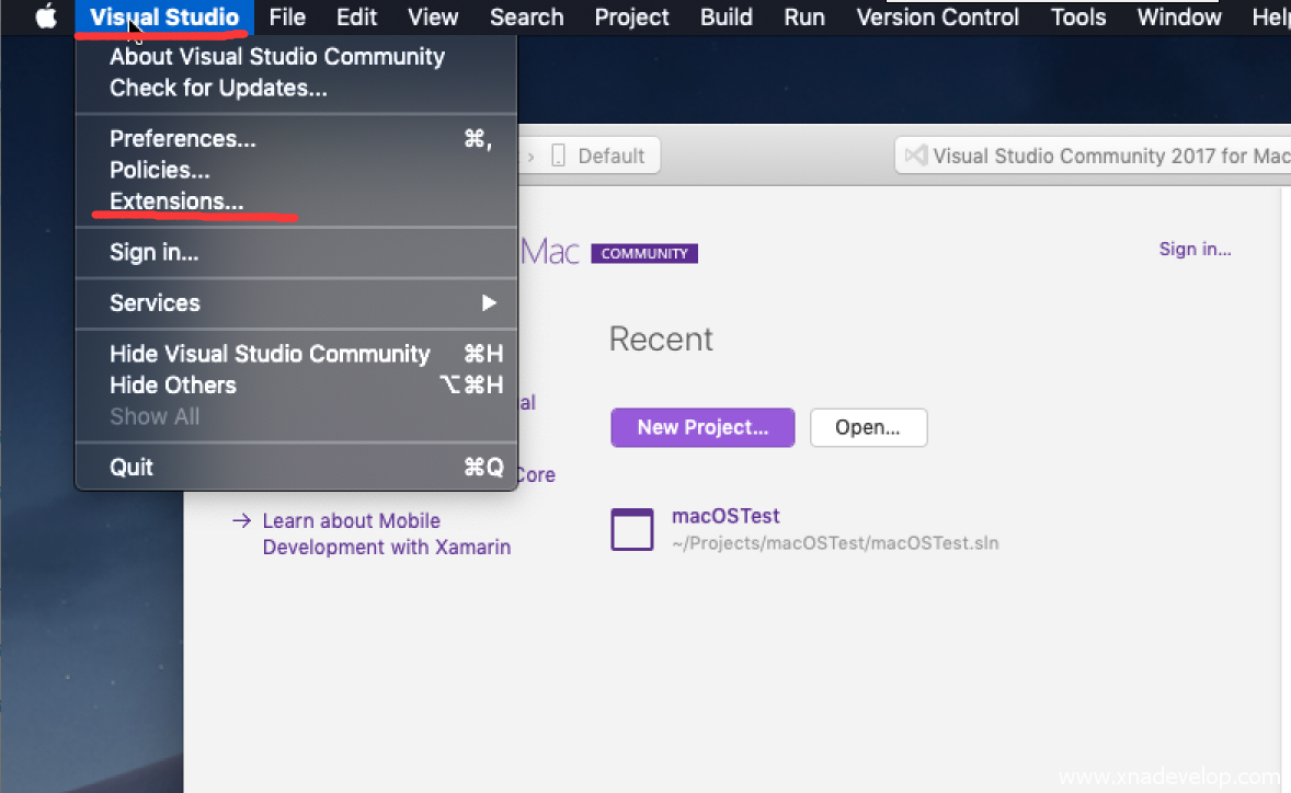点击Visual Studio 2017窗口,顶部会出现菜单栏,点击【Visual Studio】【Extensions】