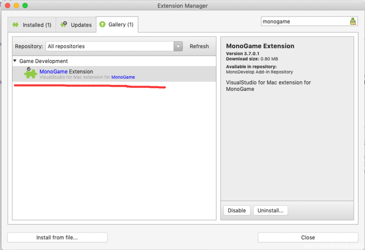 点击【Gallery】搜索【monogame】选中【MonoGame Extension】点击【Install】