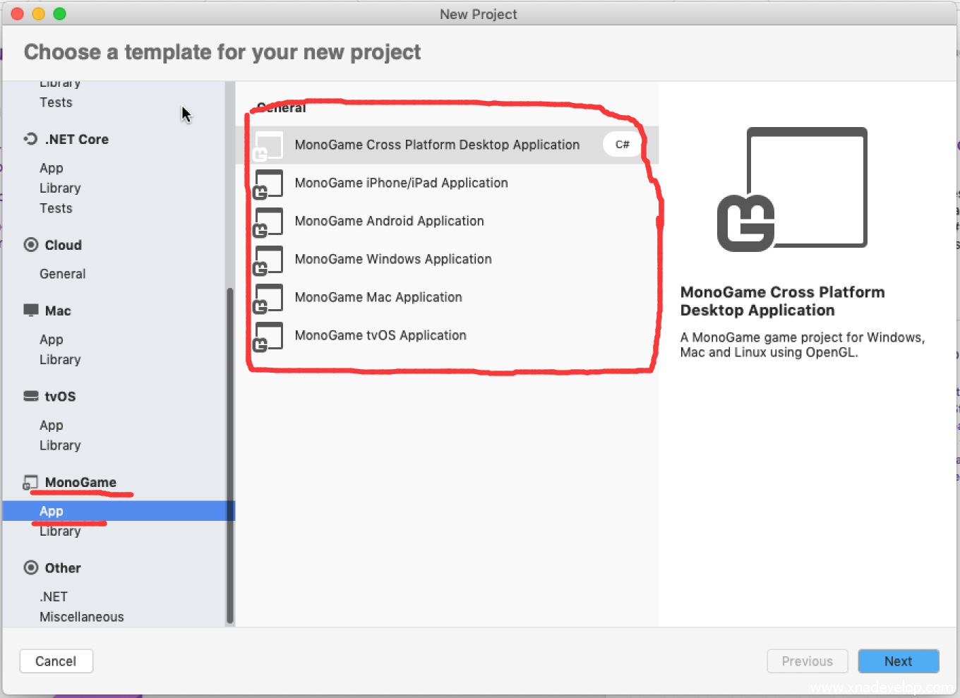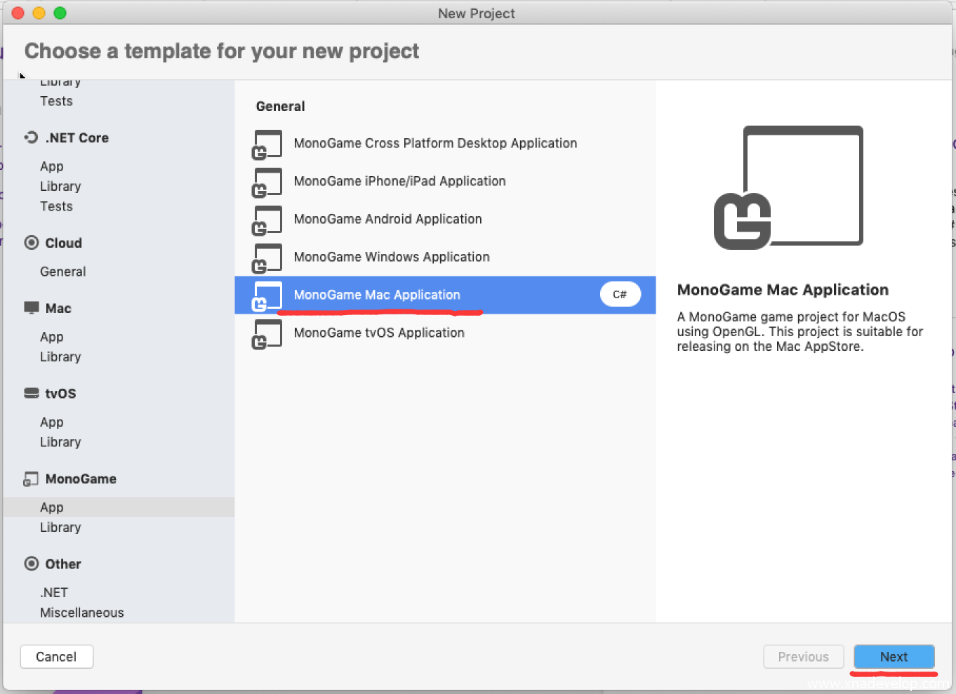 选择【MonoGame】【App】【MonoGame Mac Application】点击【Next】