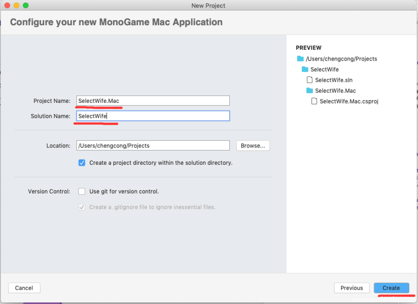 【Project Name】输入SelectWife.Mac【Solution Name】输入SelectWife,点击【Create】