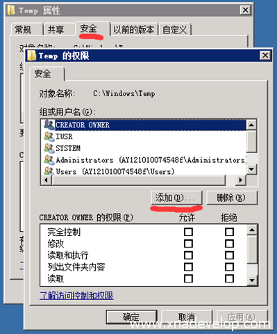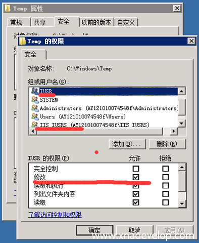 2.设置c:\windows\temp目录的权限,右键【属性】【安全】【编辑】【添加】增加IUSER和IIS_IUSERS两个用户,并添加修改权限
