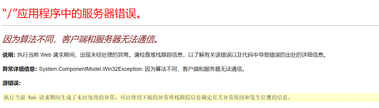 解决办法:Win32Exception (0x80004005): 因为算法不同,客户端和服务器无法通信。