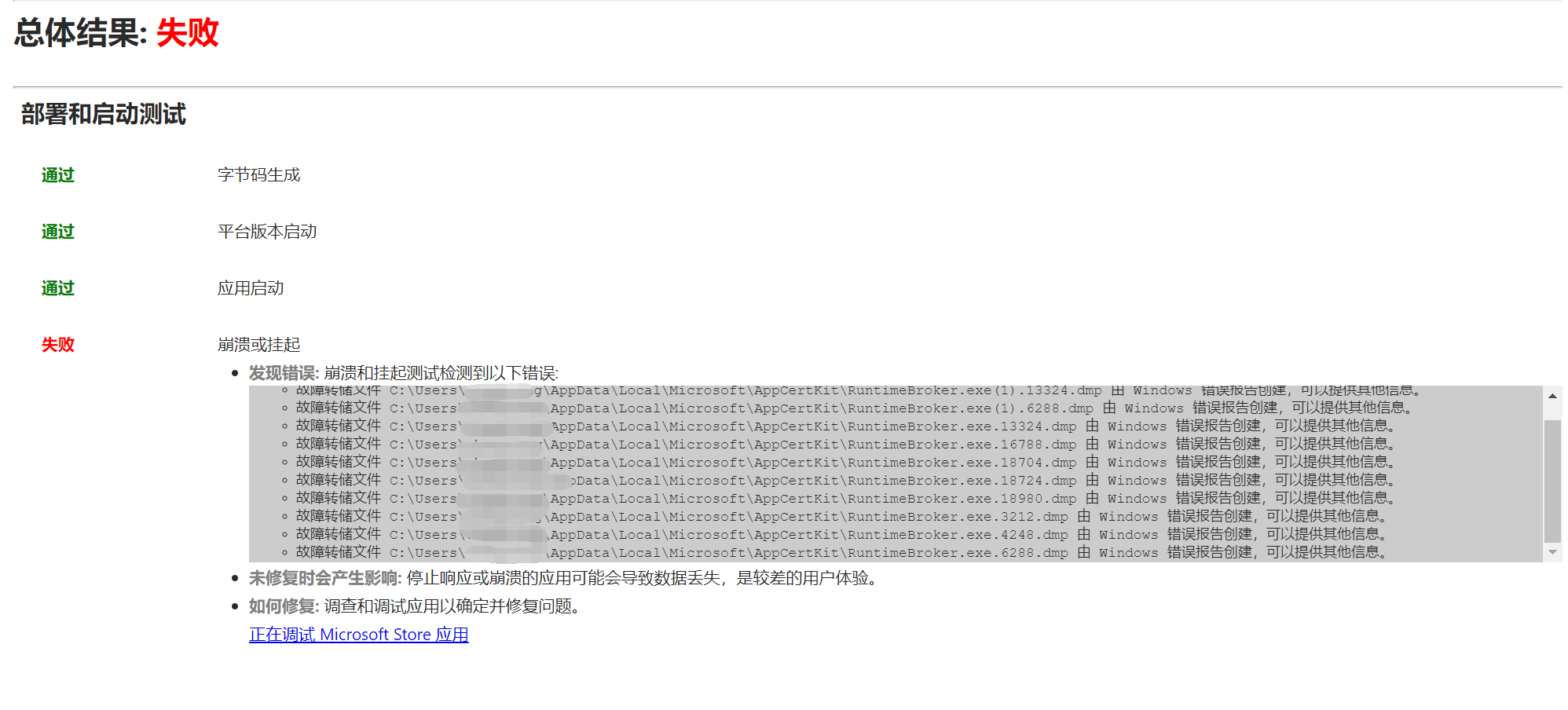 - 故障转储文件 C:\Users\username\AppData\Local\Microsoft\AppCertKit\RuntimeBroker.exe.4248.dmp 由 Windows 错误报告创建,可以提供其他信息。