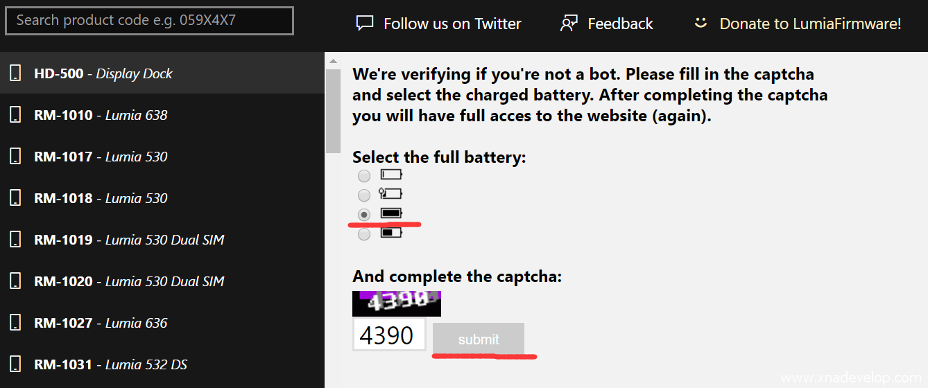 打开https://www.lumiafirmware.com/,选择电池满格状态,输入验证码,点击【submit】