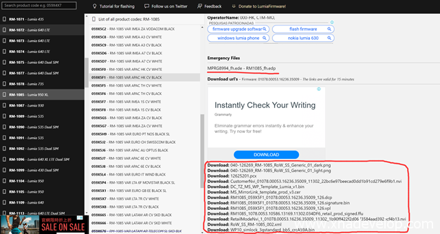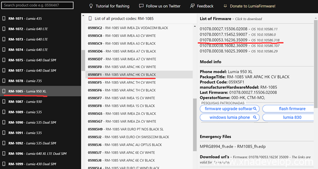 点击【RM-1085 – Lumia 950 XL】【0579X5F1】右上角会出现刷机包的下载列表,看版本可以点击最新的【01078.00053.16236.35009 – OS 10.0.10586.318】