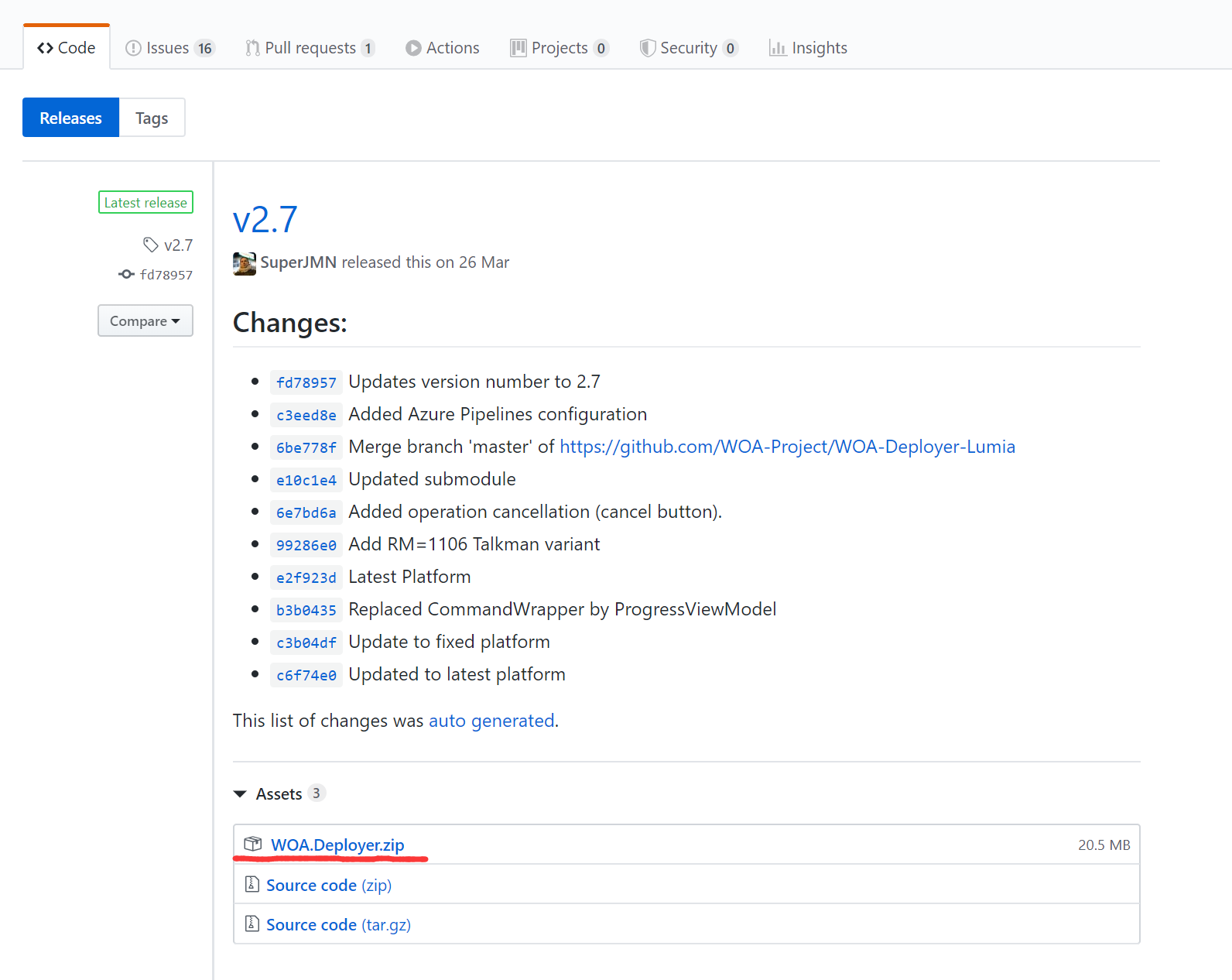 打开WOA Deployer for Lumia的官网:https://github.com/WOA-Project/WOA-Deployer-Lumia/releases,点击如下图所示的WOA.Deployer.zip