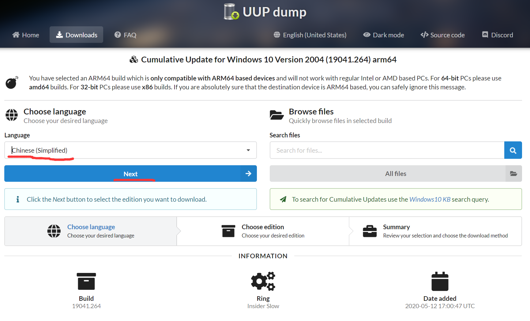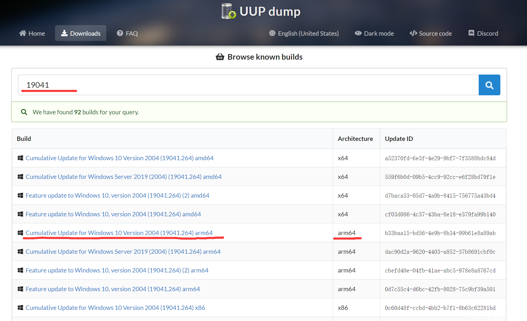 点击【Cumulative Update for Windows 10 Version 2004 (19041.264) arm64】