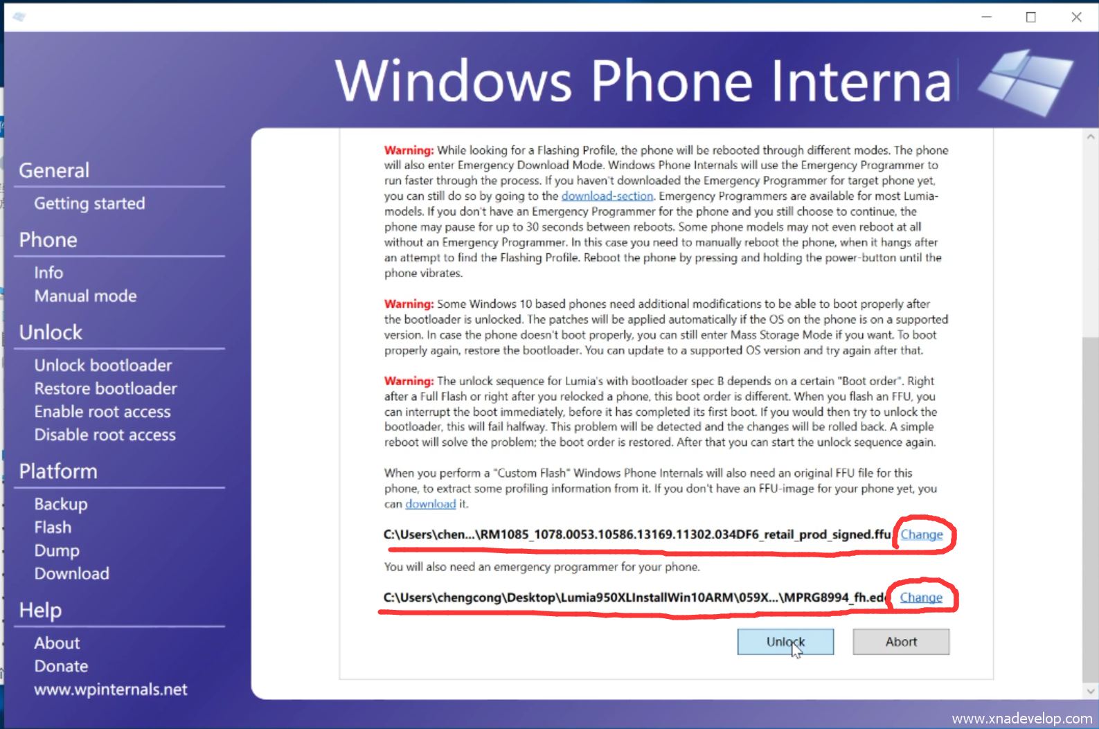 滚动条往下拉,选择之前下载好的windows10mobile系统刷机包中的.ffu文件,和.ede文件,点击【Unlock】