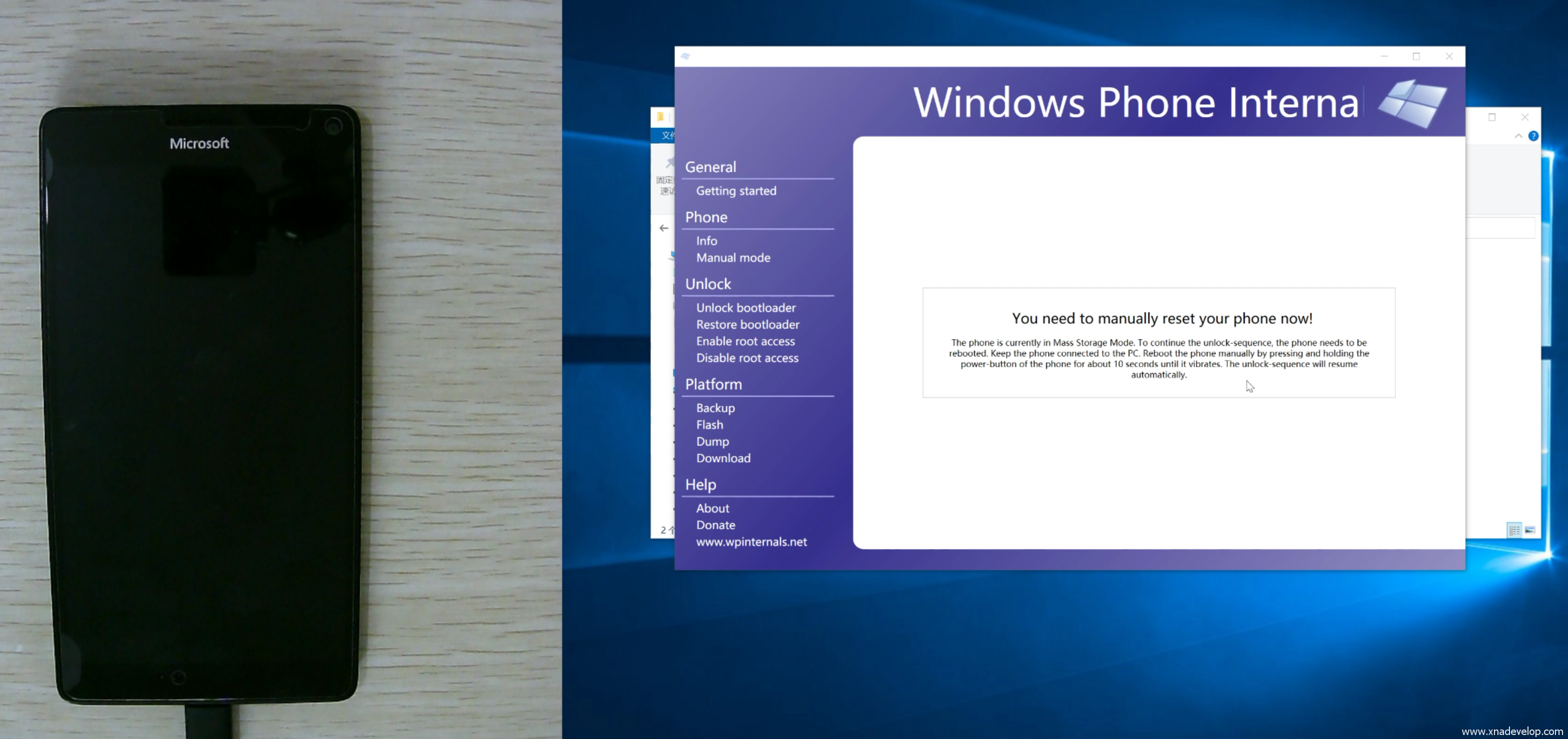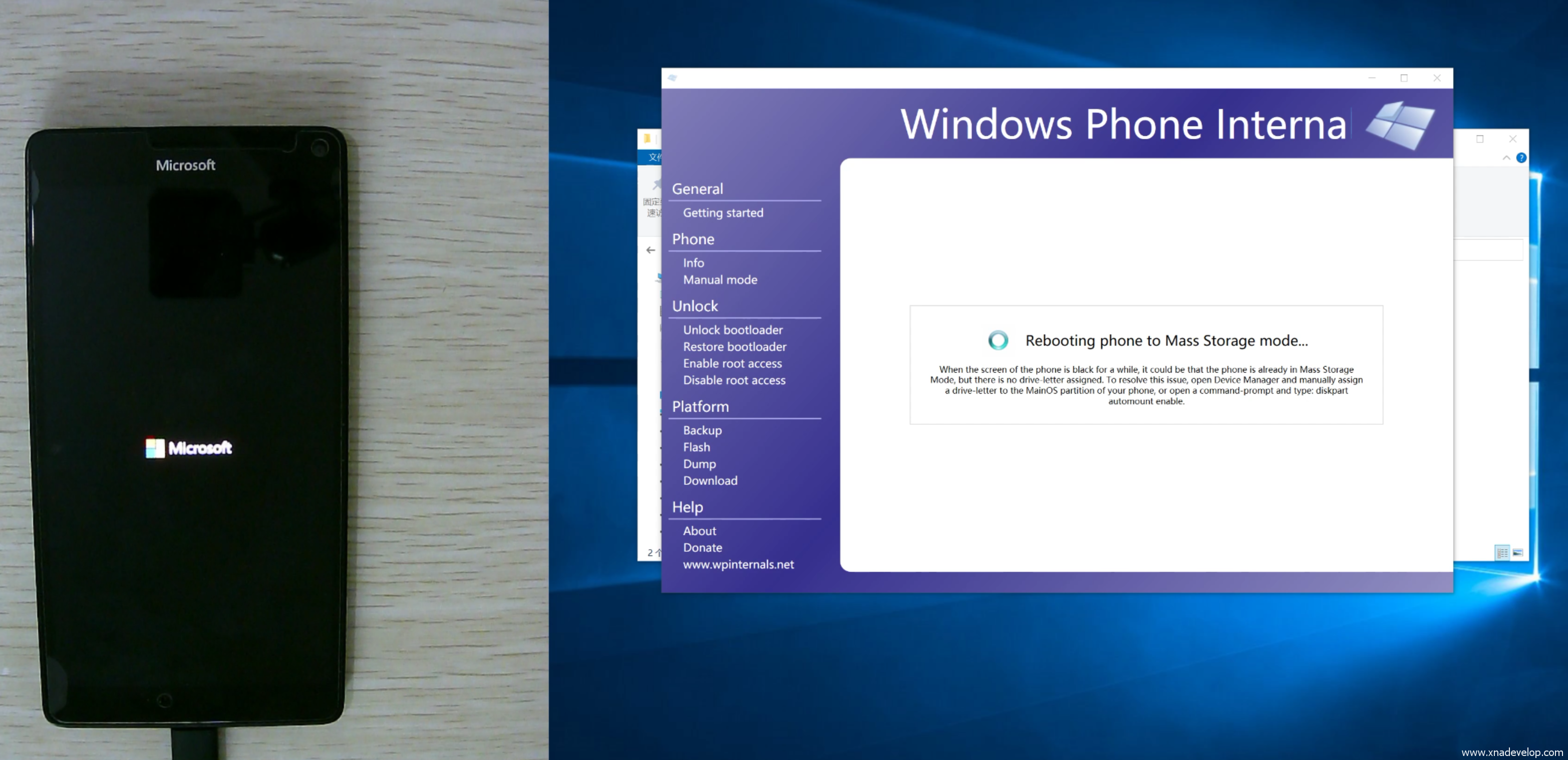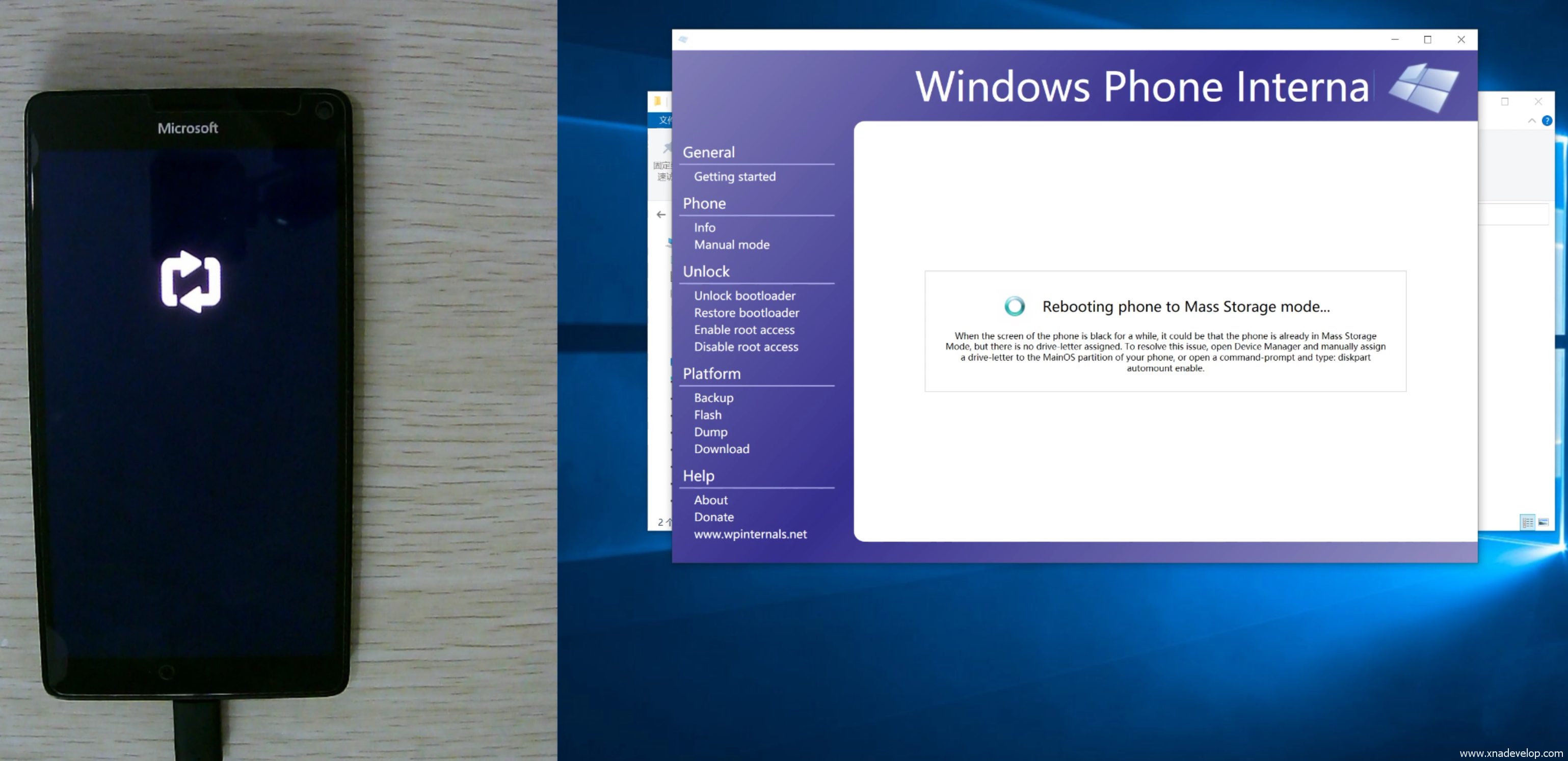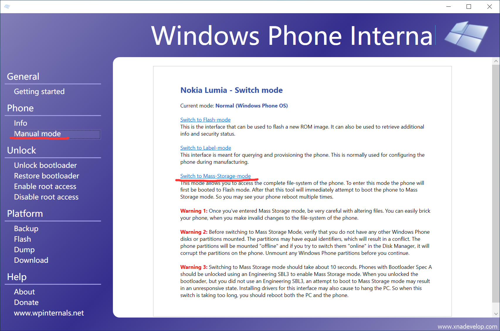 长按【电源】键,重启手机。连上数据线插入电脑。打开WPInternals,选择【Manual mode】,点击【Switch to Mass-Storage-mode】