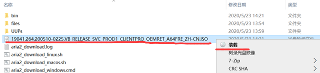 找到之前下载完成的【19041.264_arm64_zh-cn_professional_b33baa15_convert】目录中的【19041.264.200510-0225.VB_RELEASE_SVC_PROD1_CLIENTPRO_OEMRET_A64FRE_ZH-CN.ISO】文件,右键点击载入