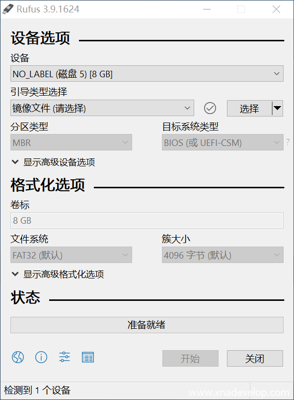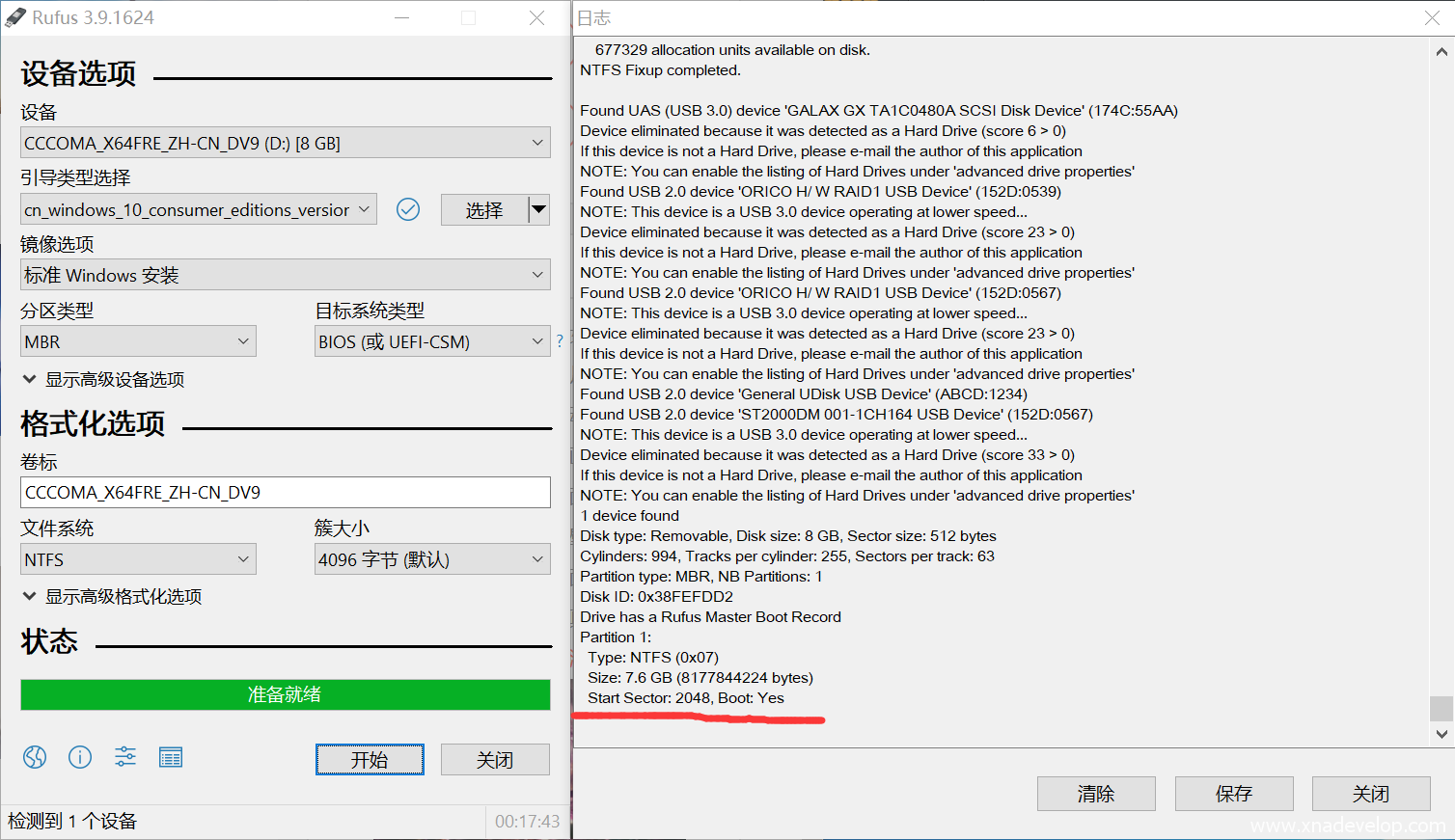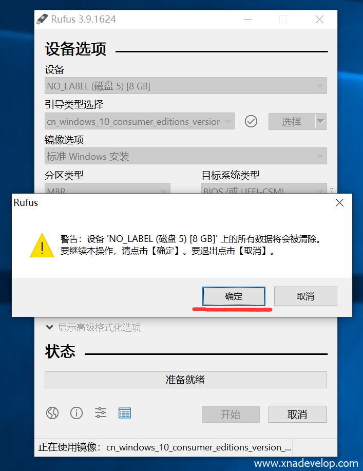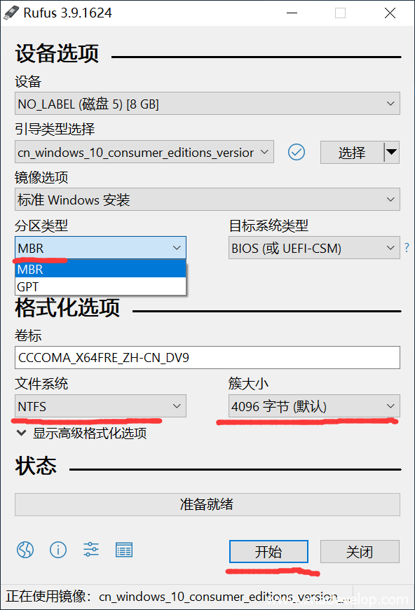 分区类型选择【MBR】,目标系统类型选择【BIOS(或UEFI-CSM)】,文件系统选择【NTFS】簇大小【4096字节】,点击【开始】,其他具体设置看下图: