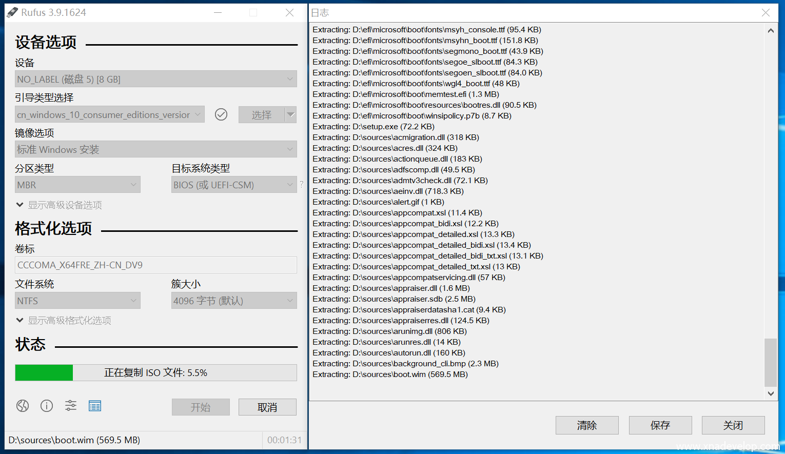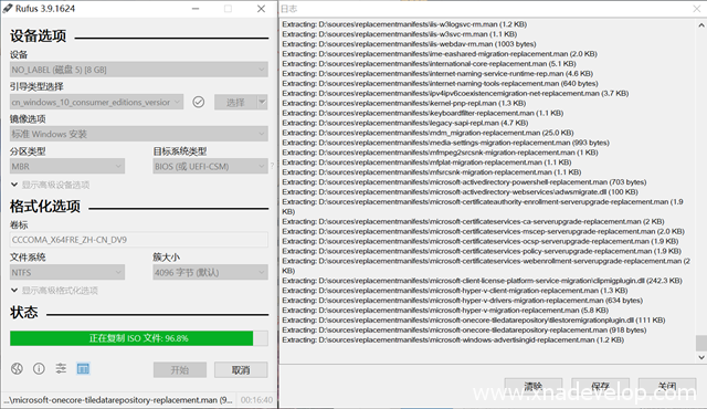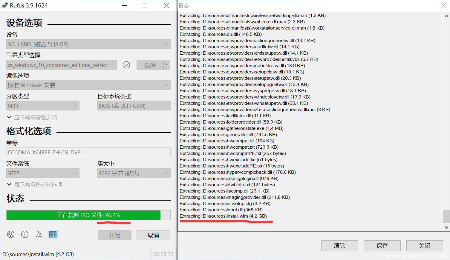 当进度条读到96.2%左右,会卡很长时间,因为它正在往U盘写入install.wim一个4.2GB的文件。要耐心等待它完成!