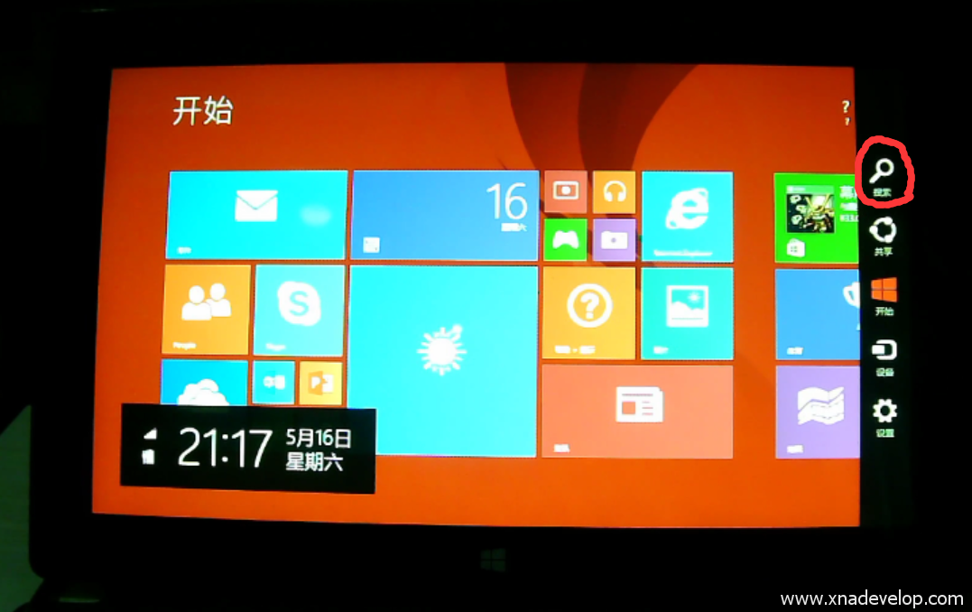 将U盘插入SurfaceRT,手指从屏幕左侧边缘往内滑动呼出开始按钮,点击开搜索。输入【创建】