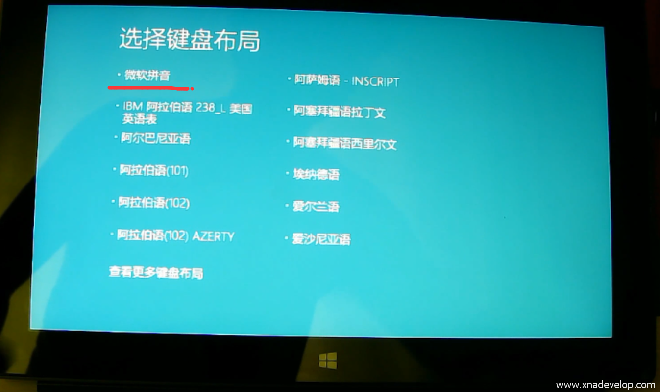 当界面出现【选择键盘布局】时,点击【微软拼音】