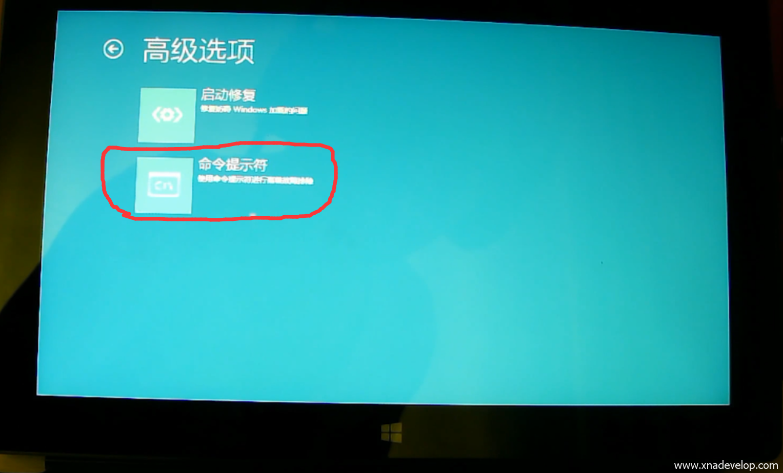 5.如果出现无法启动系统,插上之前备份的U盘,按住音量减,按开机键后放开,继续按住音量减,看到Surface字样以后放开音量减,进入命令行模式后 输入 【bootrec / rebuildbcd 】,输入Y 回车重启