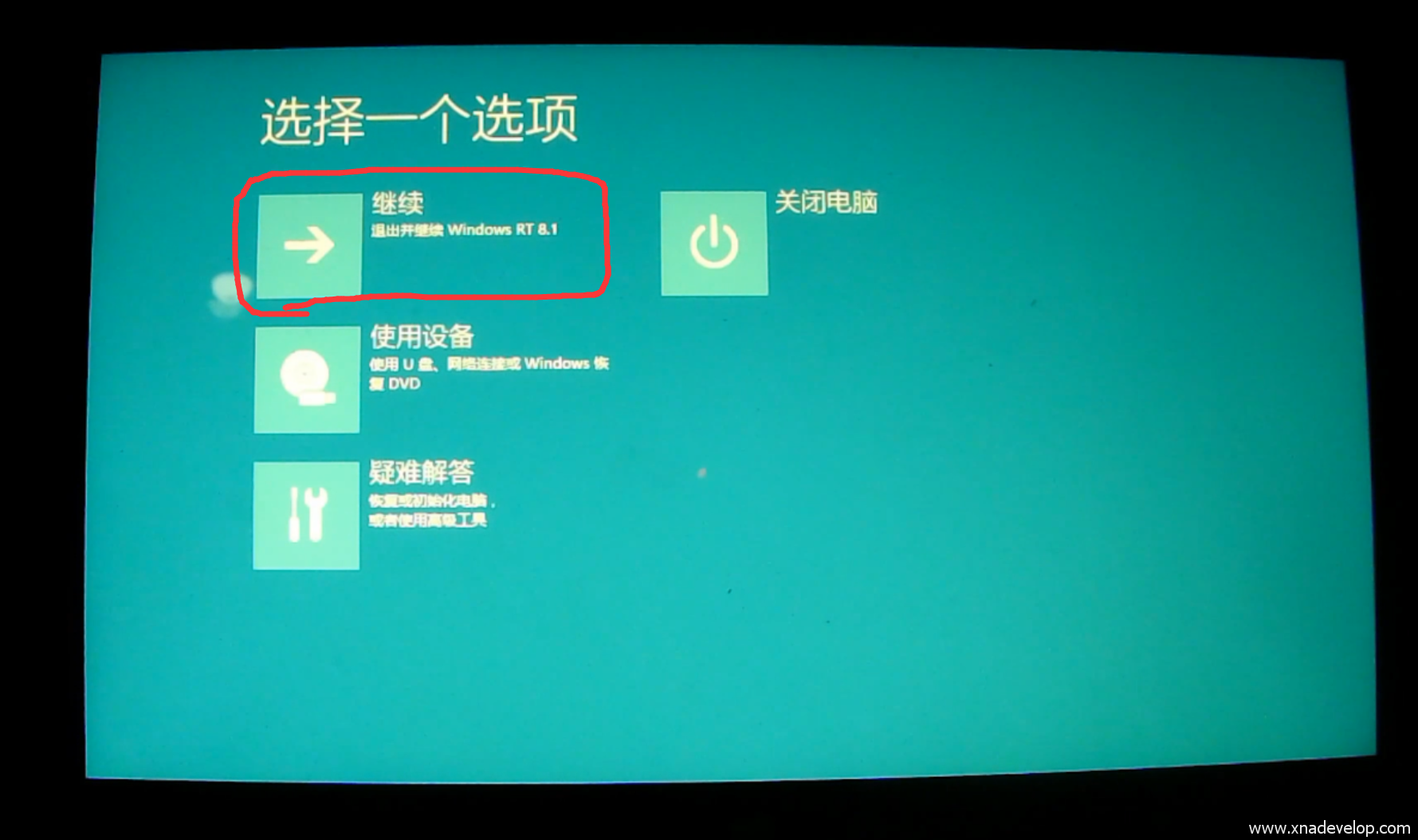 拔下U盘,插入Surface RT.按住【音量减】键,接着按下【开机】键放开,直到屏幕上显示【Surface】字样,然后放开【音量减】键,