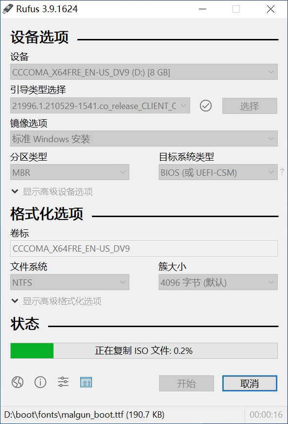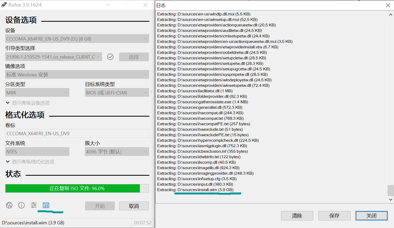 当刻录到96%左右的时候,它在复制install.wim文件这个文件非常大3.9G,你可以点开日志查看。注意不需要做任何操作,等待即可!