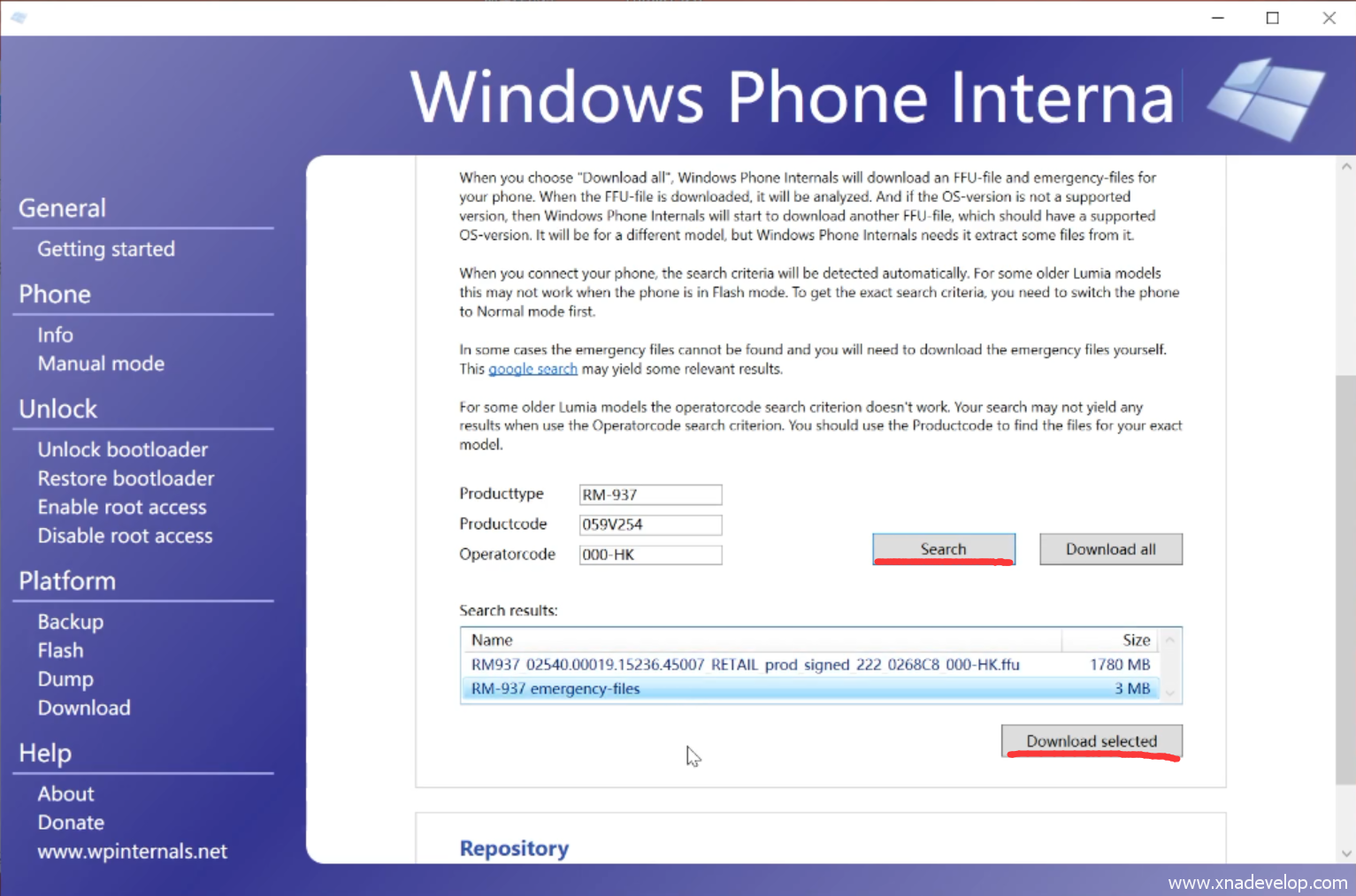 往下拉,点击【Search】,之后Search results下面就会显示两个文件,按住键盘的ctrl键选中这两个文件,点击【Download selected】,等待下载完成!如果你的手机和我的型号是一样的,那么可以跳过这一步,刷机包中已经提供了,即【059V254 – RM-937 VAR APAC HK CV WHITE】文件夹。