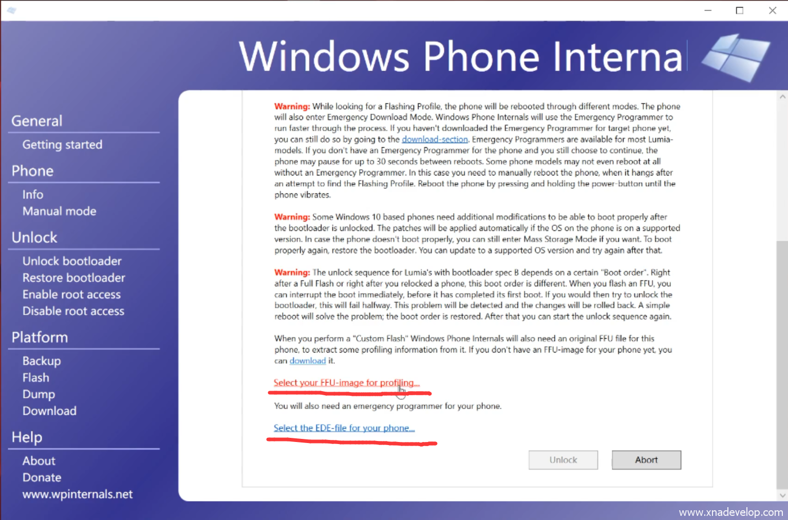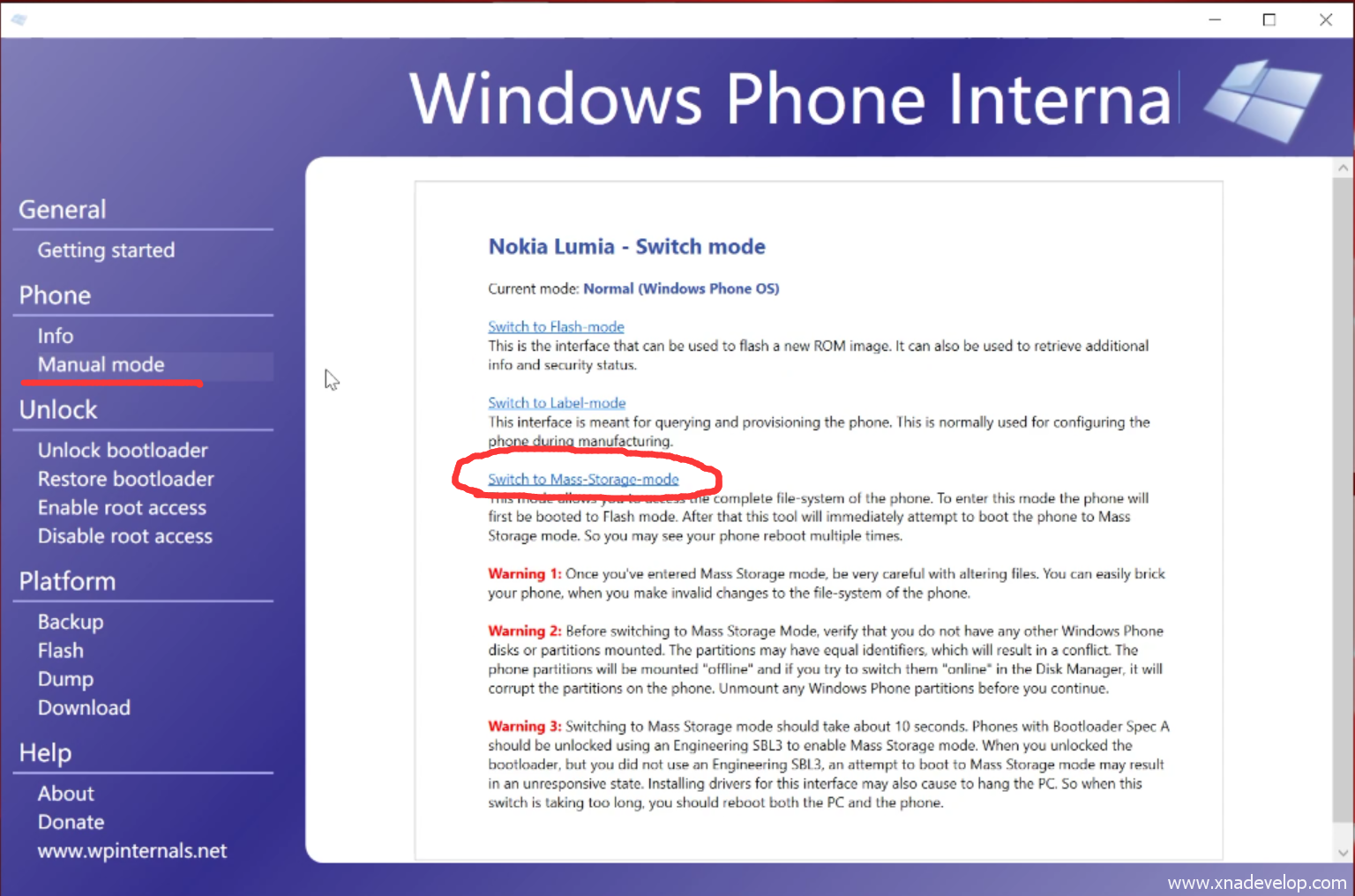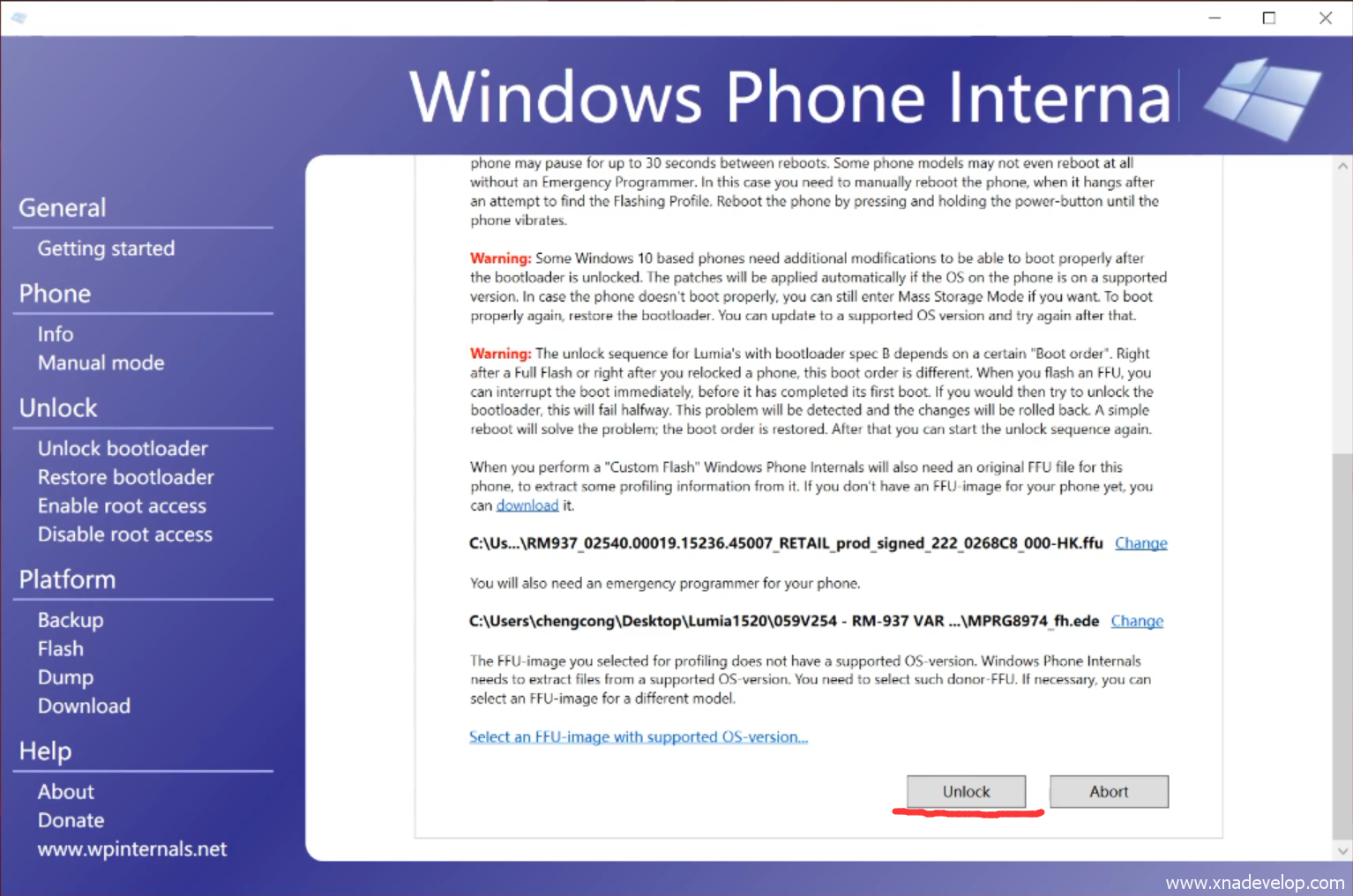 手机重启后进入flash mode,WPInterals窗口往下拉。