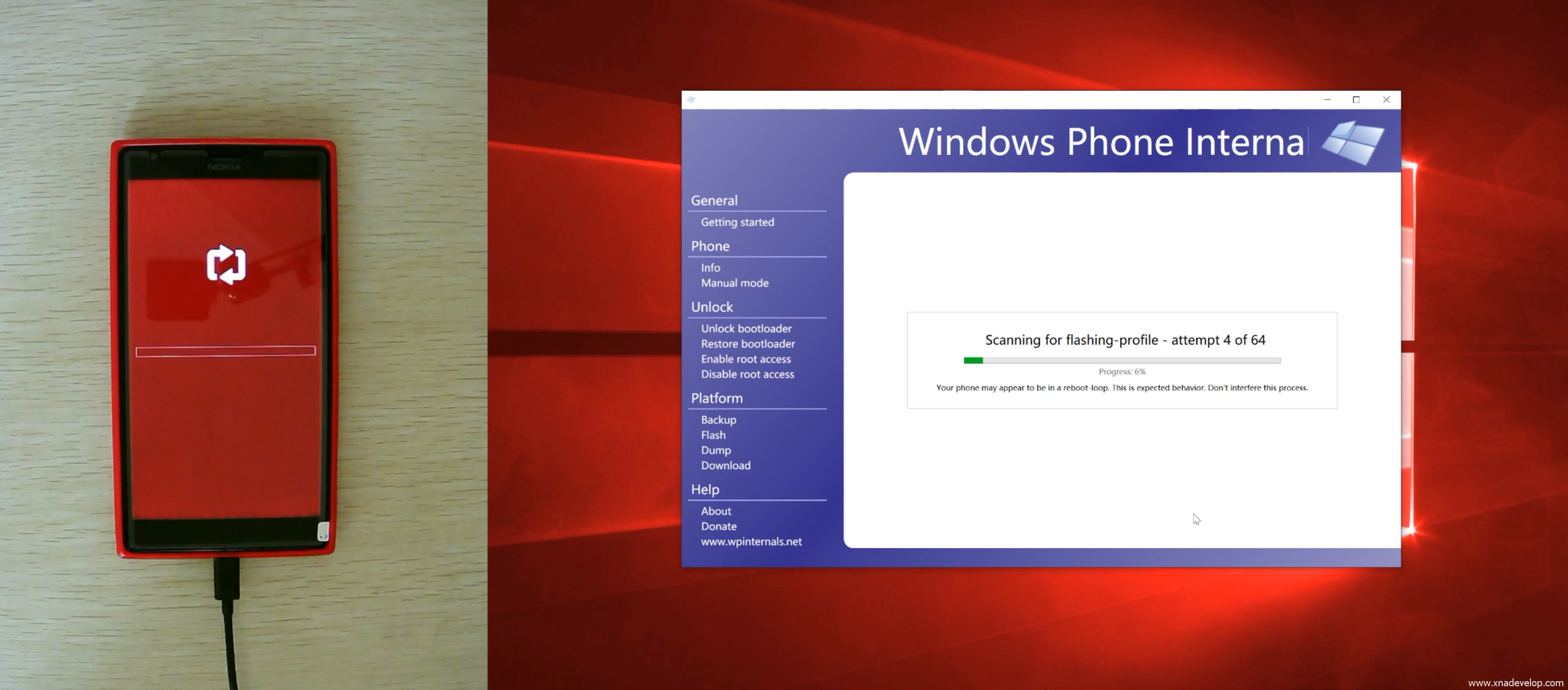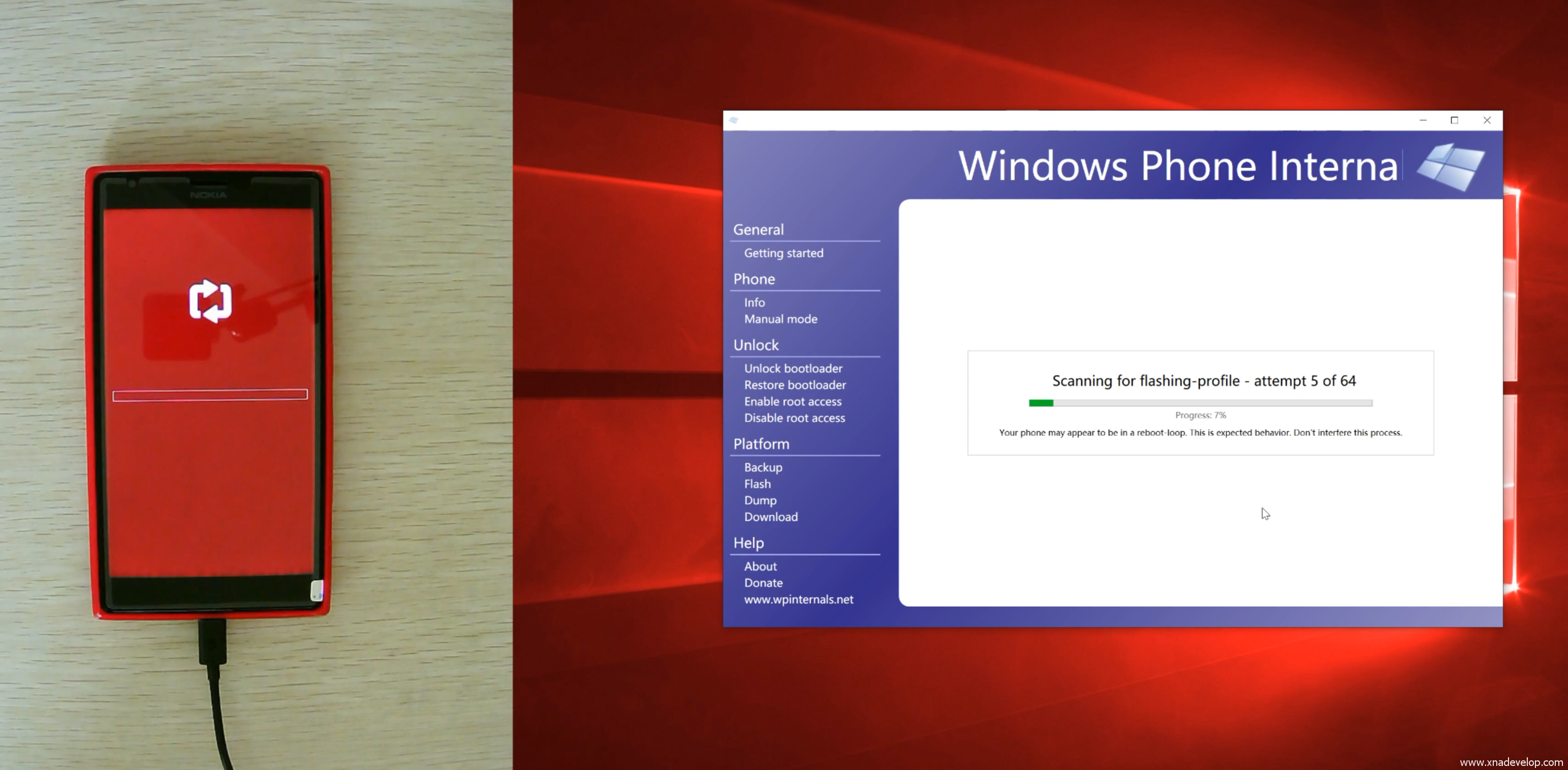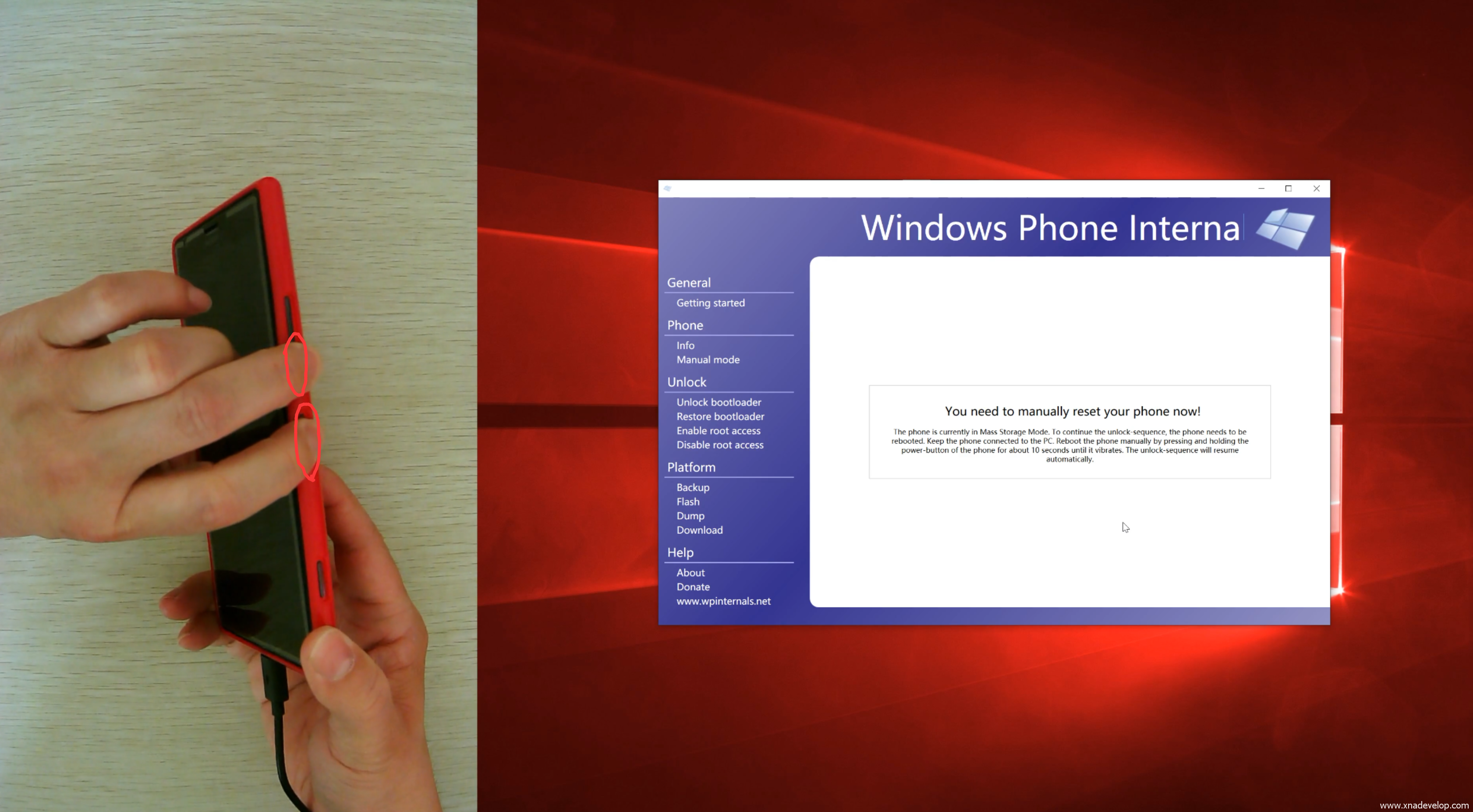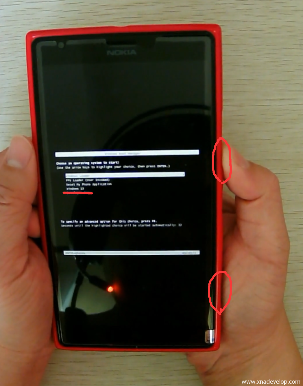 WPInternals出现如下图界面时,同时按住【音量下键】和【开机键】直到手机震动,放开手。重置手机