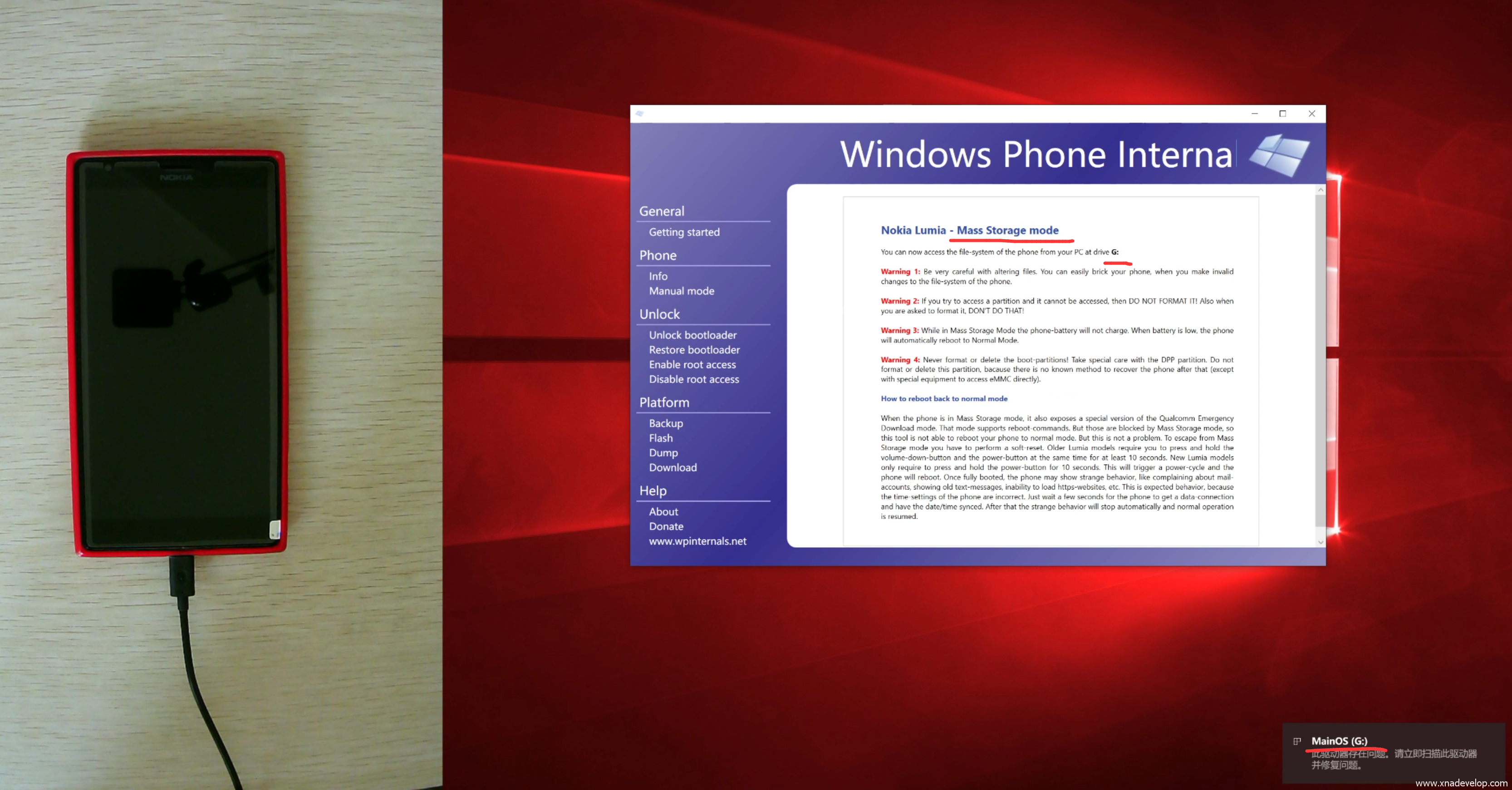 打开刷机包文件夹中的WPInternals目录中的【WPInternals.exe】,手机插上数据线连到电脑上。