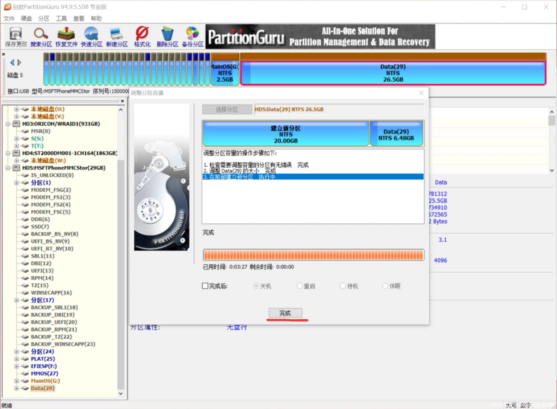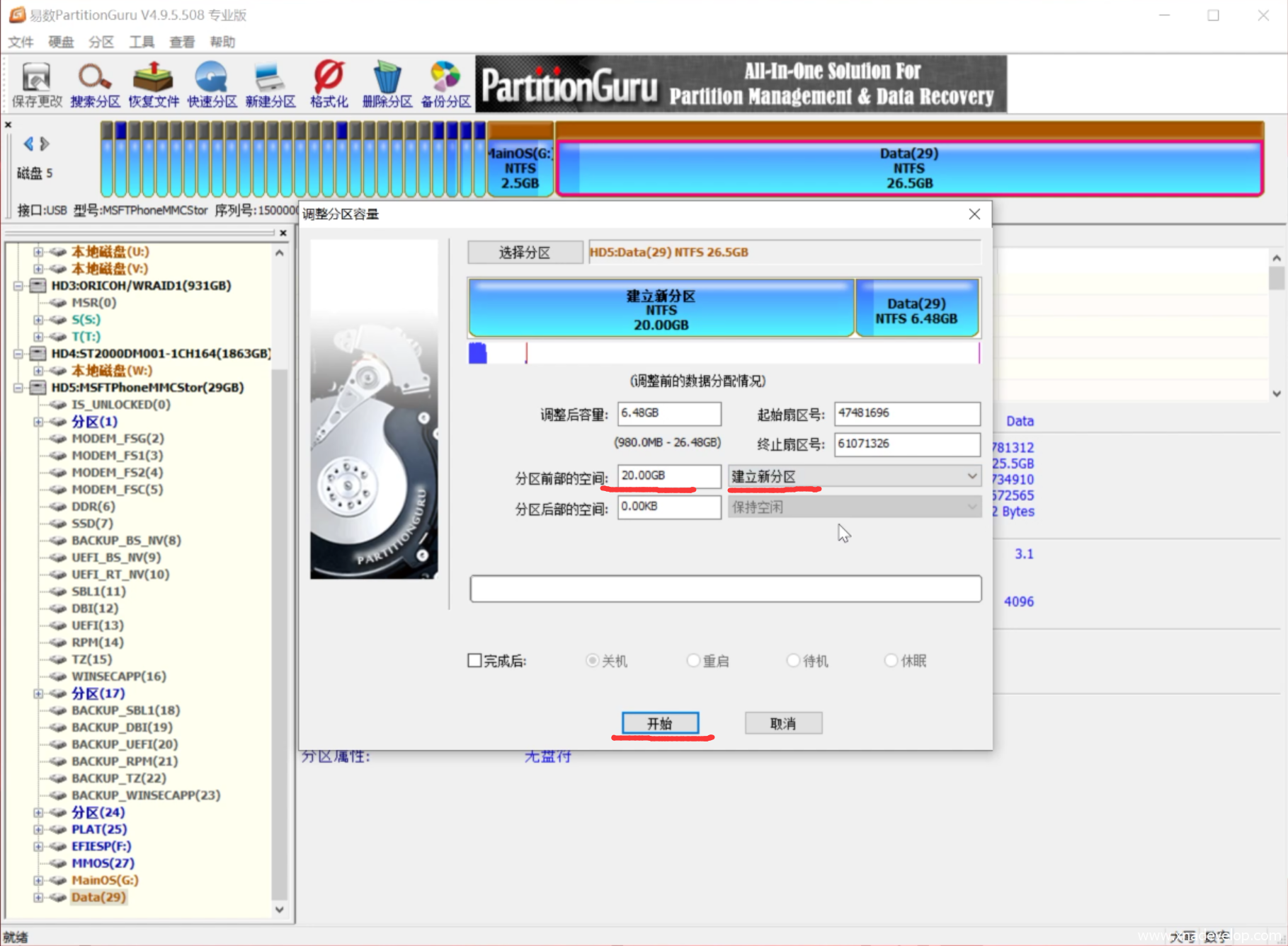 【分区前部的空间】输入20.00GB。如果你的手机16G,可是输入12.00GB