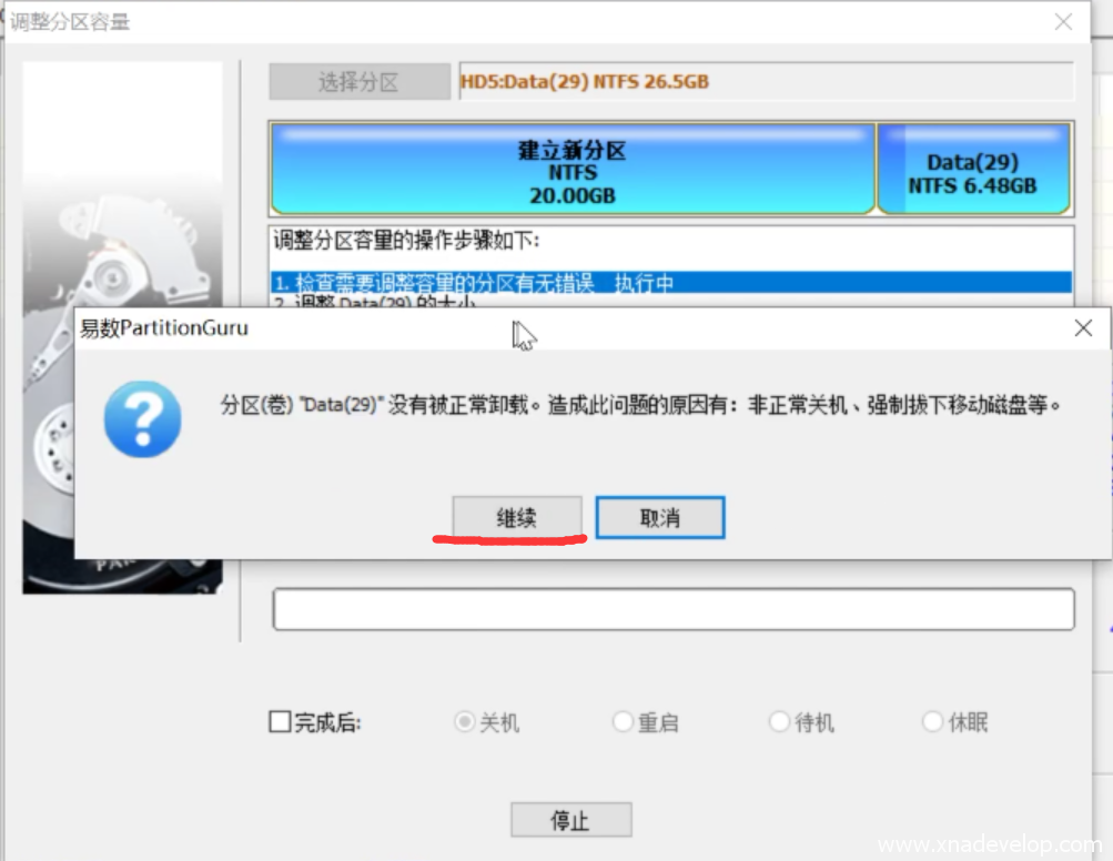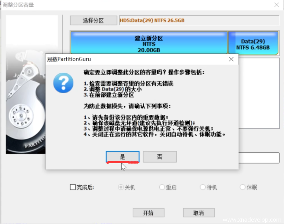 后面【保持空闲】修改位【建立新的分区】,点击【开始】