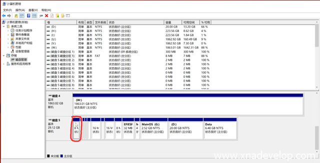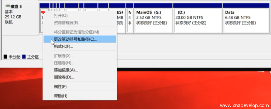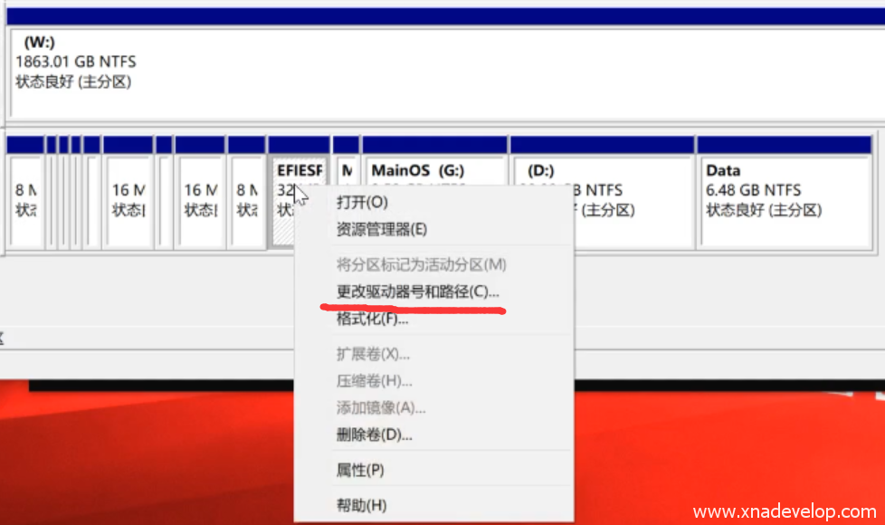 选择最前面8MB的分区,点击鼠标右键【更改磁盘驱动器号和路径】