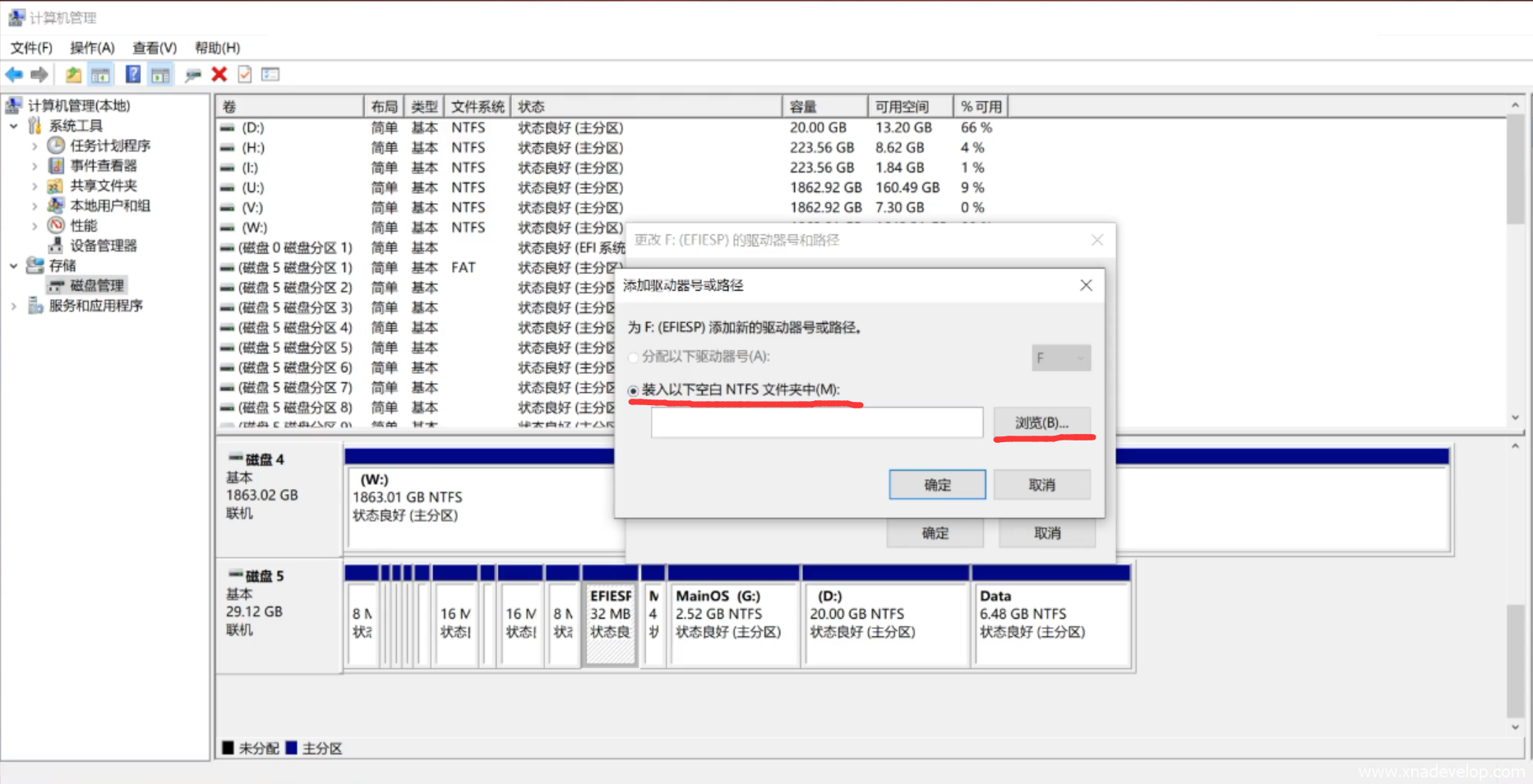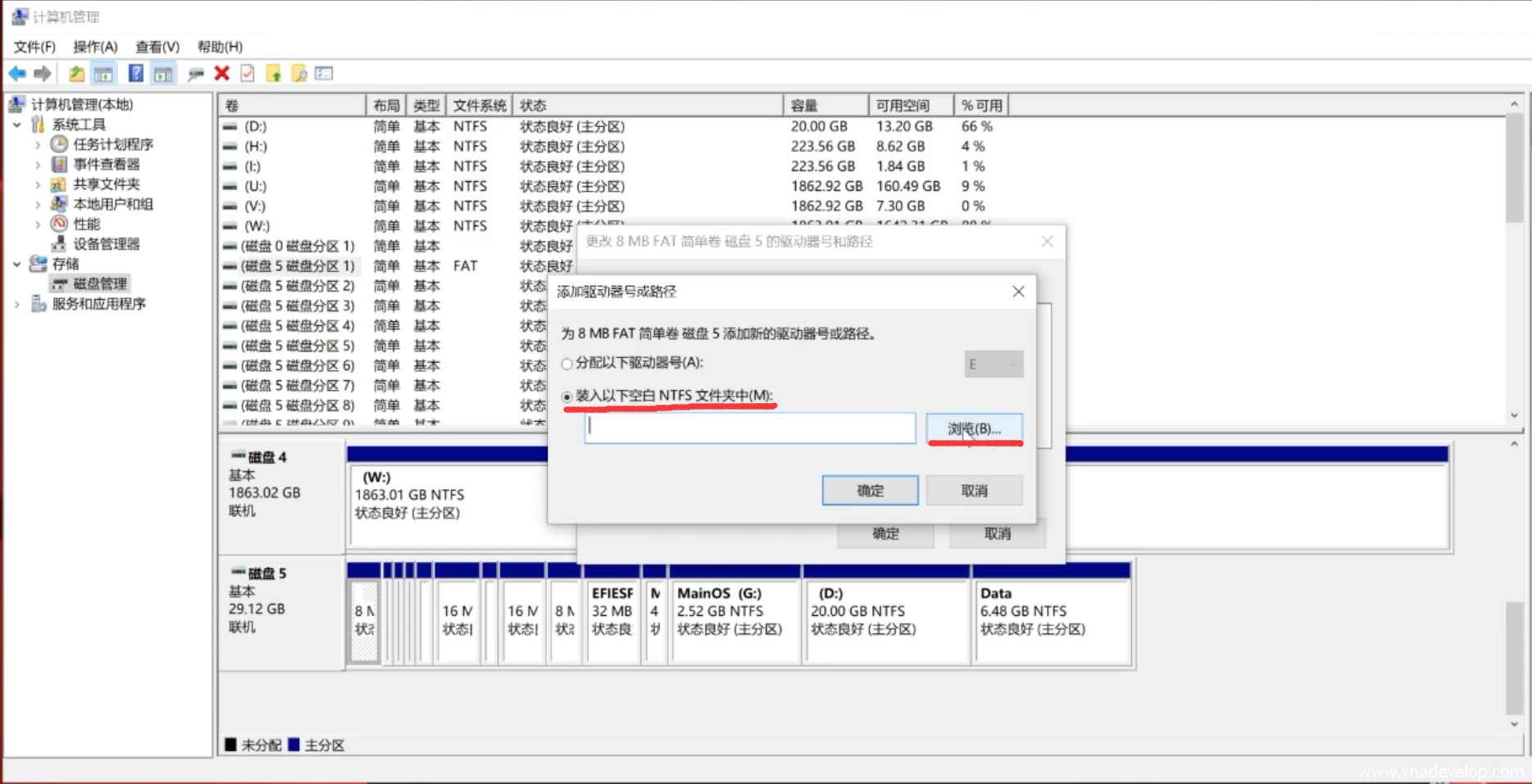 选择【装入以下空白NTFS文件夹中】,点击【浏览】