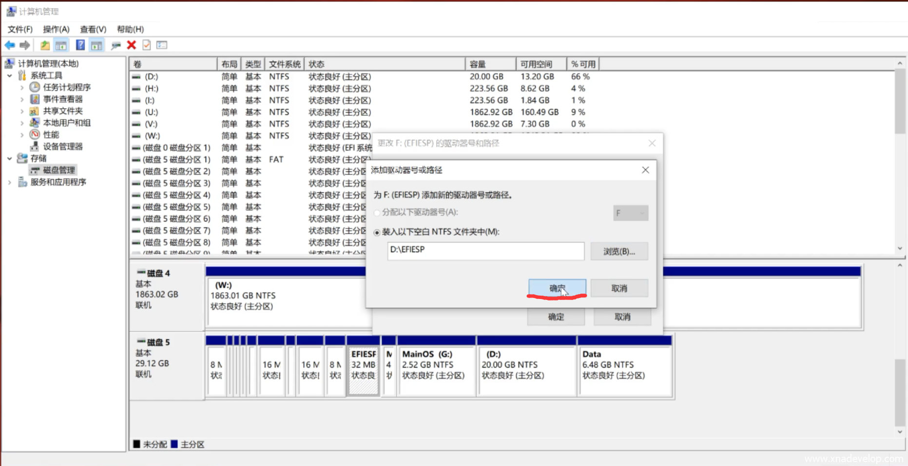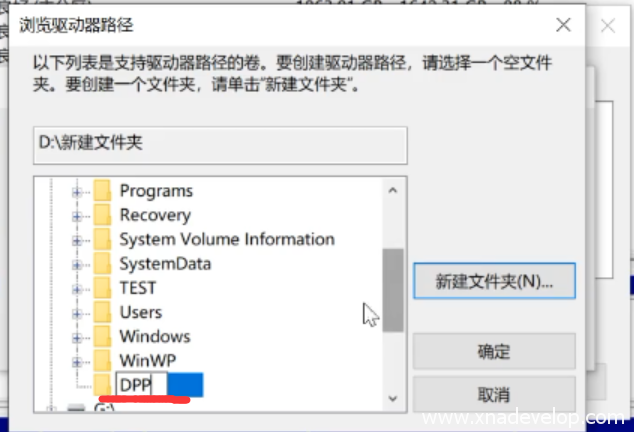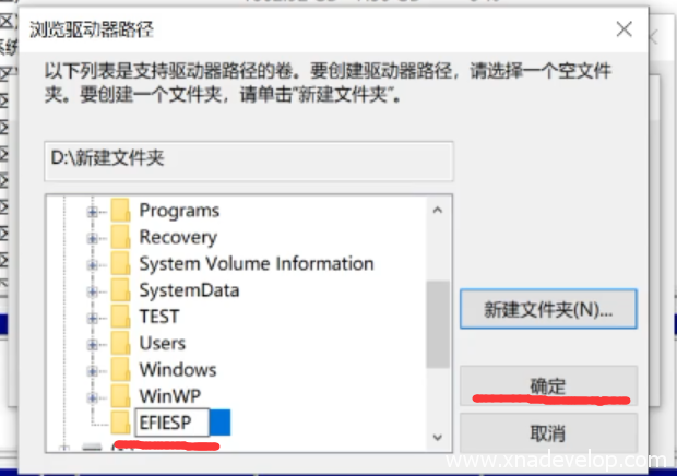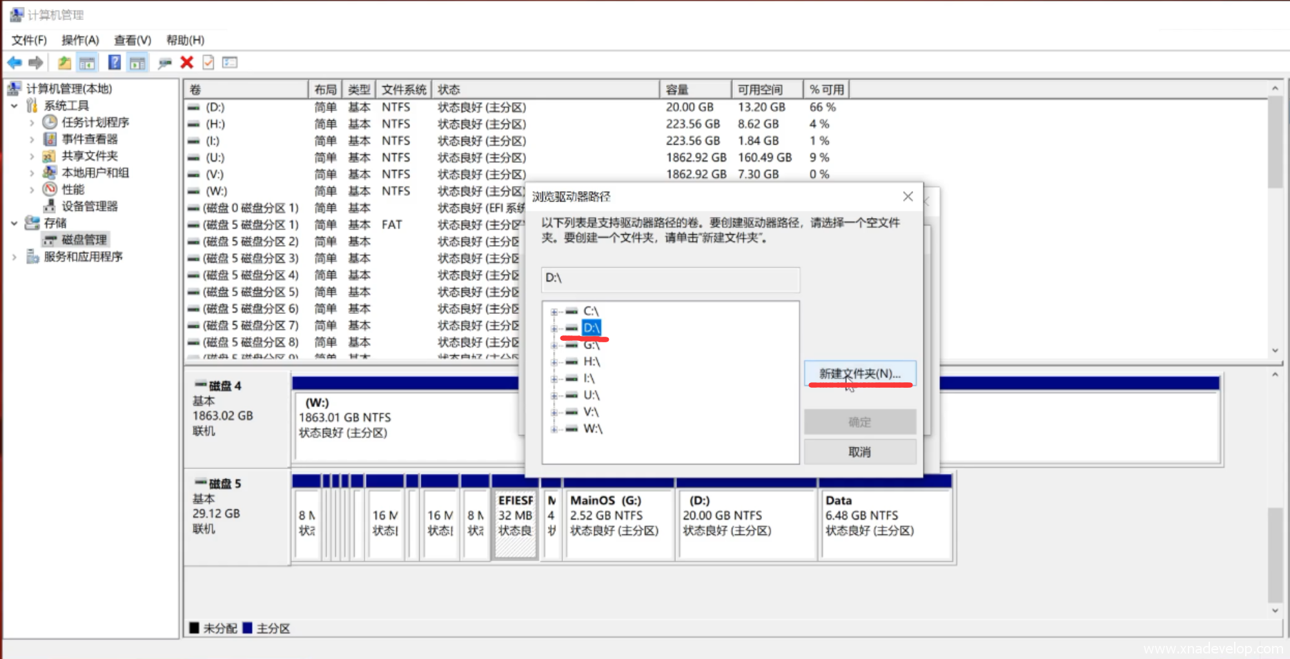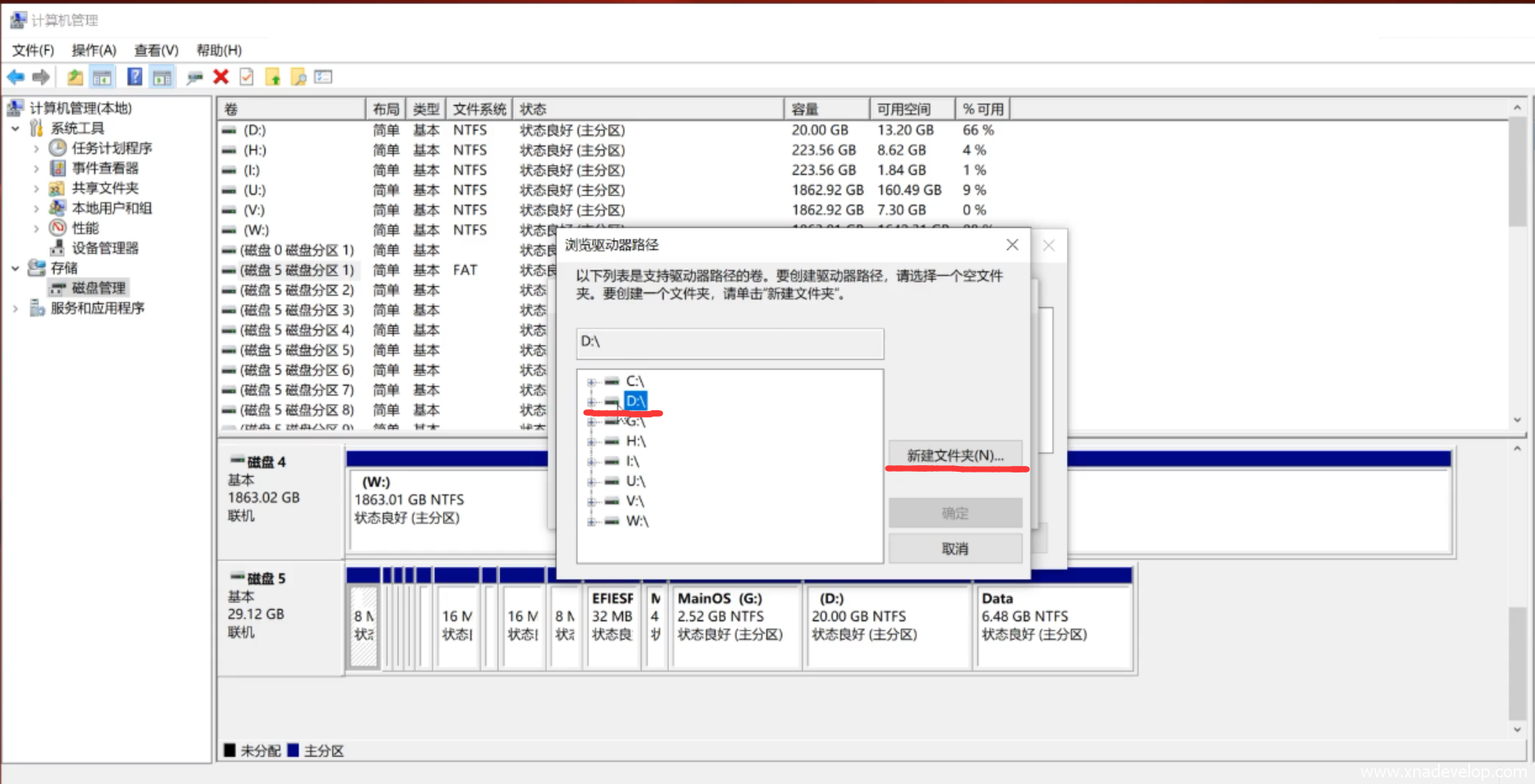 选中之前用分区软件分出的20G硬盘盘符,我这里是D盘,所以选择D盘,点击【新建文件夹】