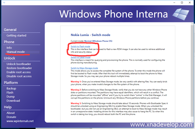 2.打开Windows Phone Internals,选择Manual mode,点击Switch to Flash-mode,进入刷机模式