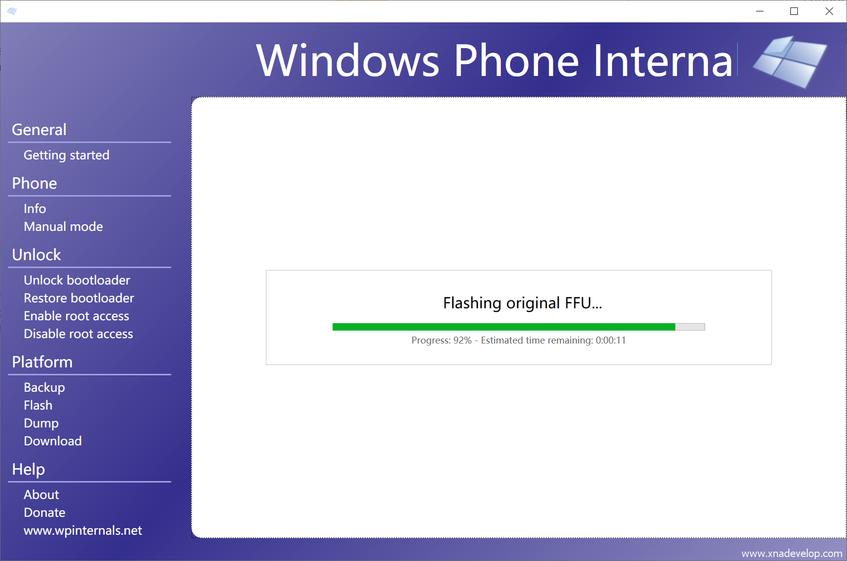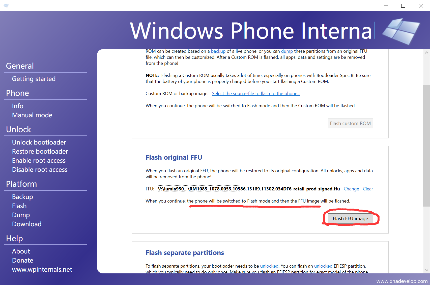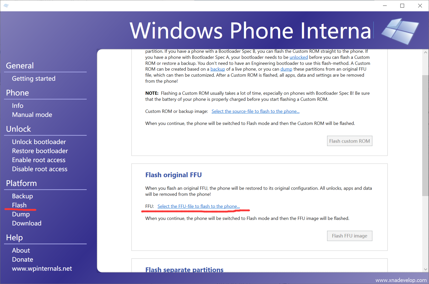 点击【FLASH】,往下拉找到【Flash orginal FFU】,点击【Select the FFU-file to flash to the phone】