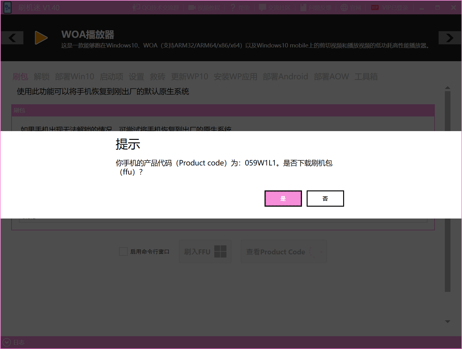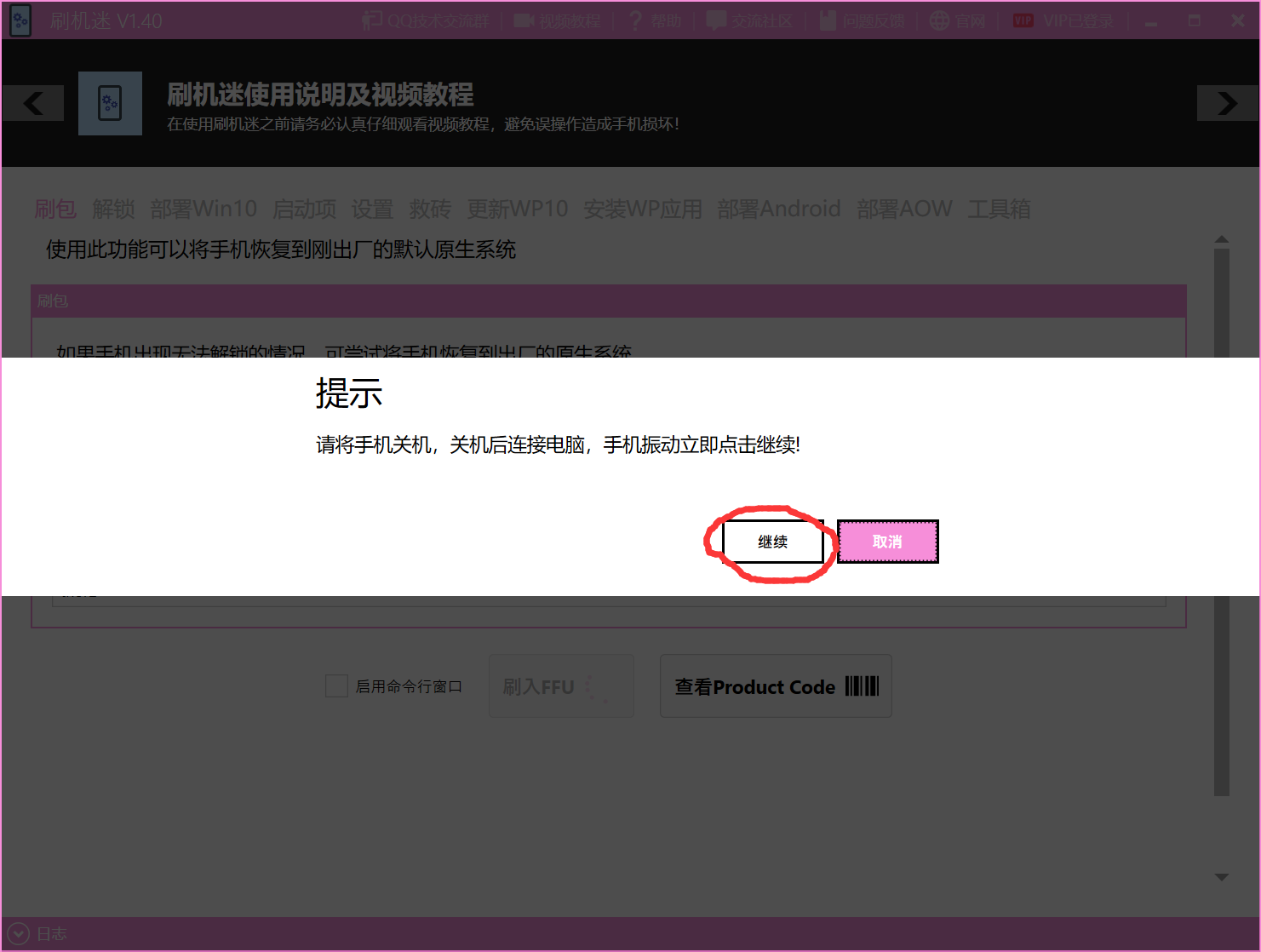 点击【刷入FFU】,这时候会弹出一个提示。先不要点【继续】,